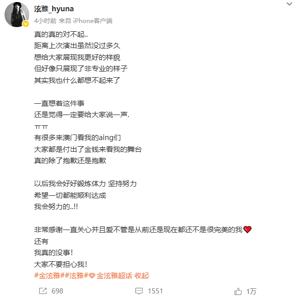 事发当晚10点,泫雅在 Instagram 发布了韩英双语长文,搭配黑色背景图,手写体的笔迹肉眼可见地颤抖。她在文中反复道歉:“真的真的很抱歉,大家都是花钱来看的,却看到这样的场面,我本来想展现最好的状态”。