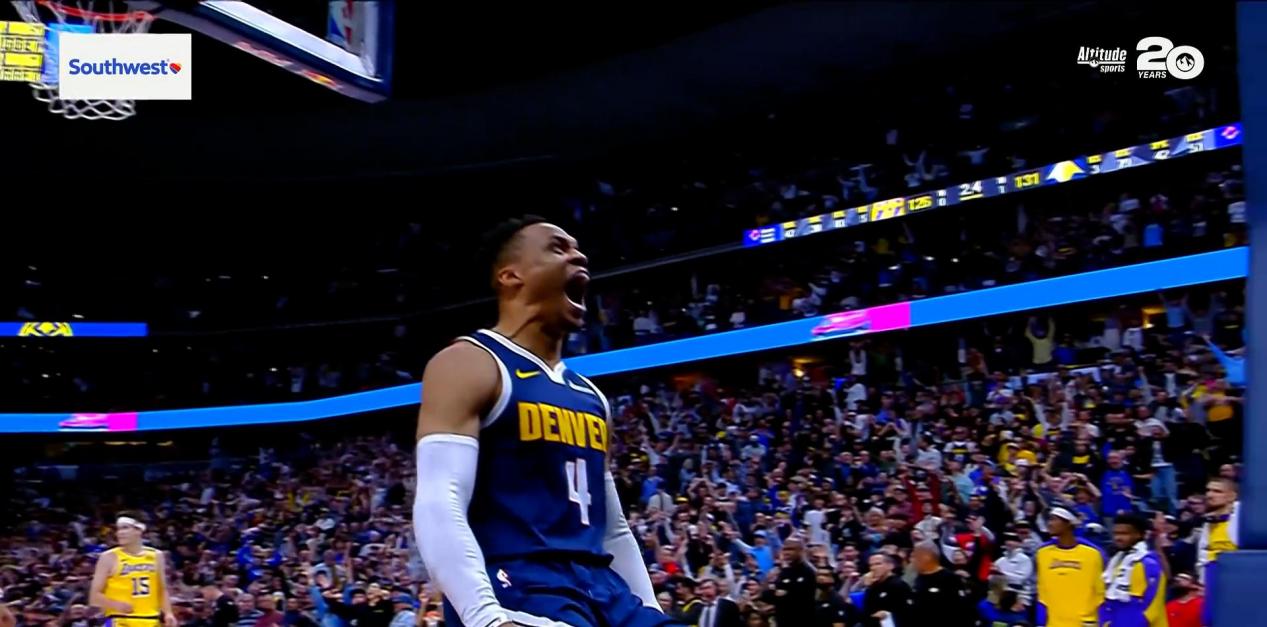 气氛瞬间高潮,威少在得分后朝观众席怒吼,激动之情溢于言表。