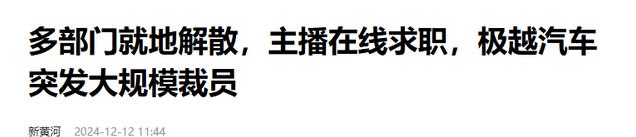 来源:新黄河2024-12-12——《多部门就地解散,主播在线求职,极越汽车突发大规模裁员》的报道