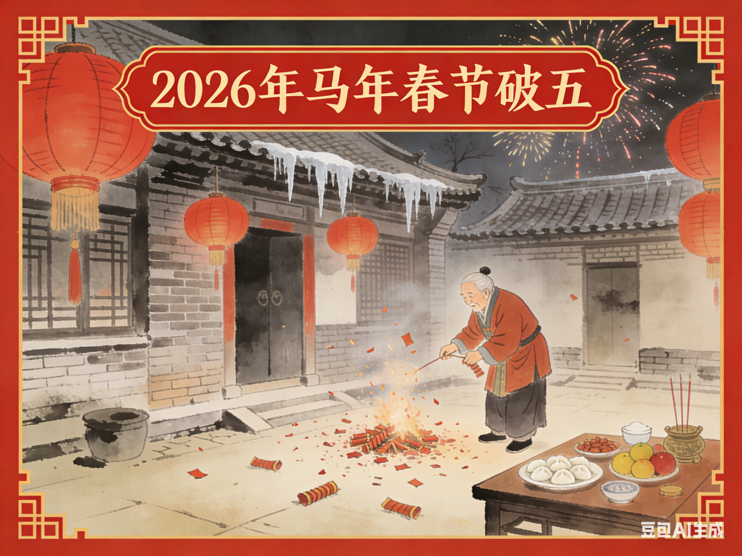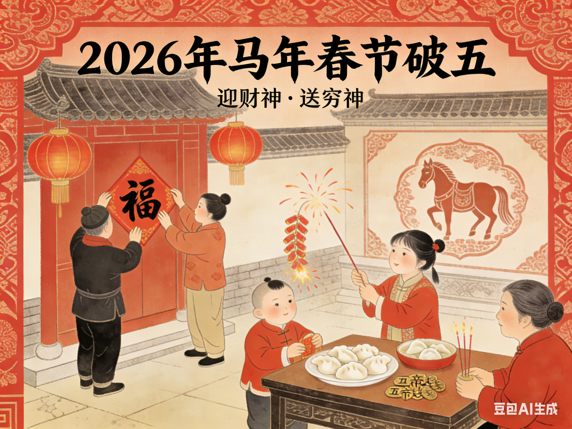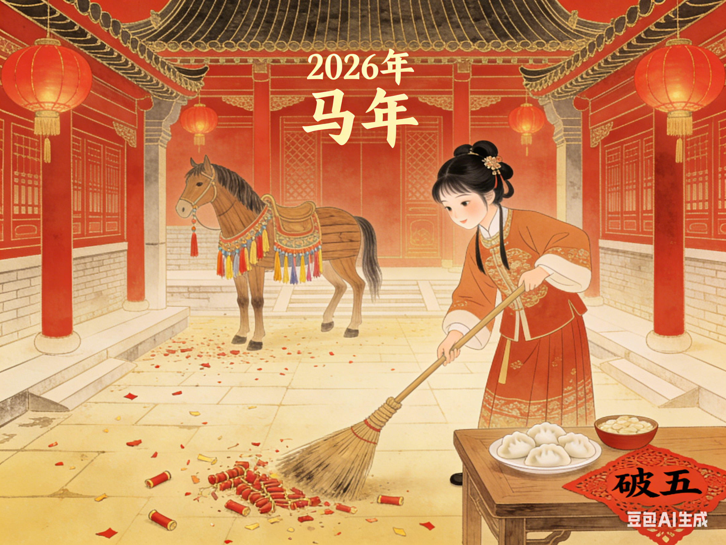 正月初五,俗称破五、迎财日、送穷日,亦有“隔五”“五穷日”之称,是春节期间承前启后的重要日子。它上承除夕至初四的年节喜庆,下启年后正常生活与劳作,既是年俗的集中体现日,也是古人寄托祛邪避灾、招财纳福心愿的核心节点。
