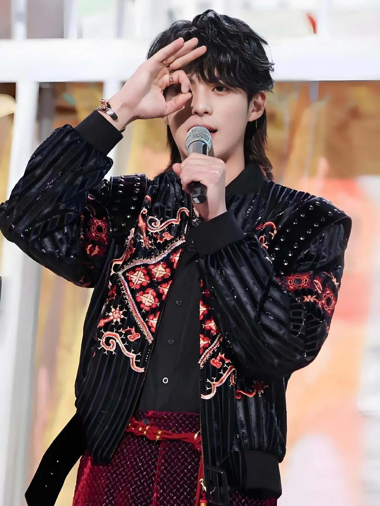 王鹤棣搭配的皮衣外套,有热血高校那味了,花花日出演唱会,白金色酷炫亮眼。