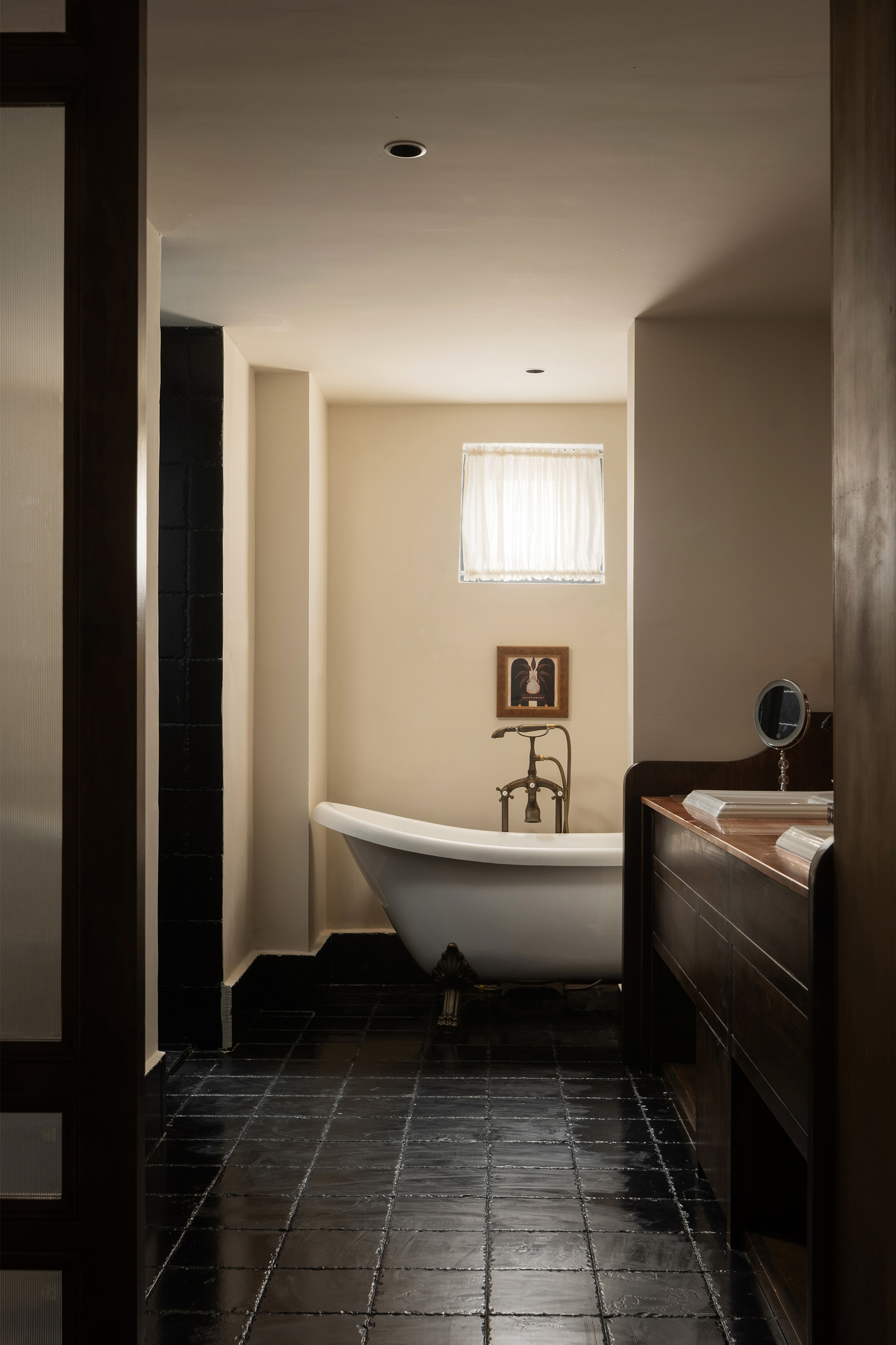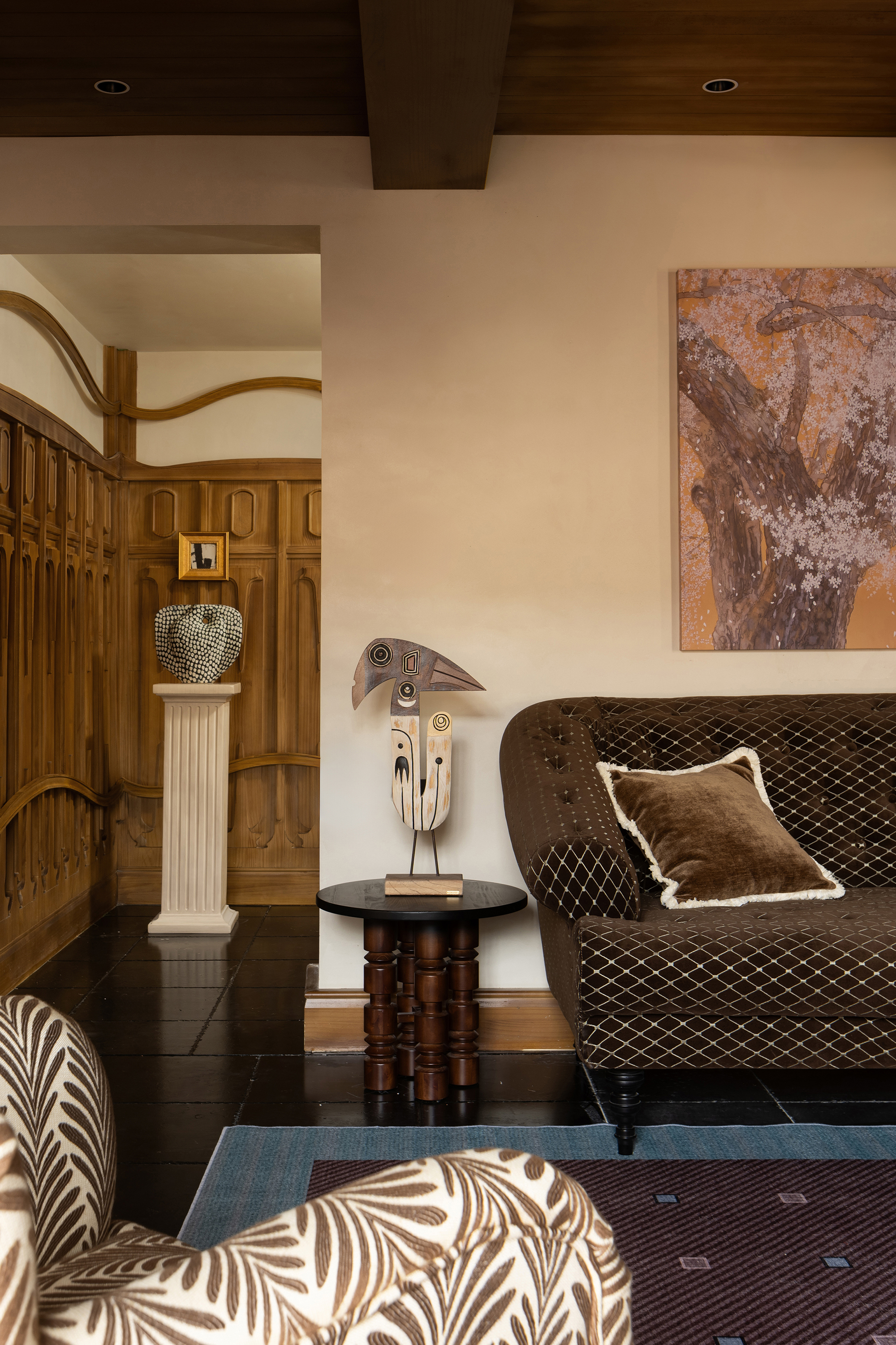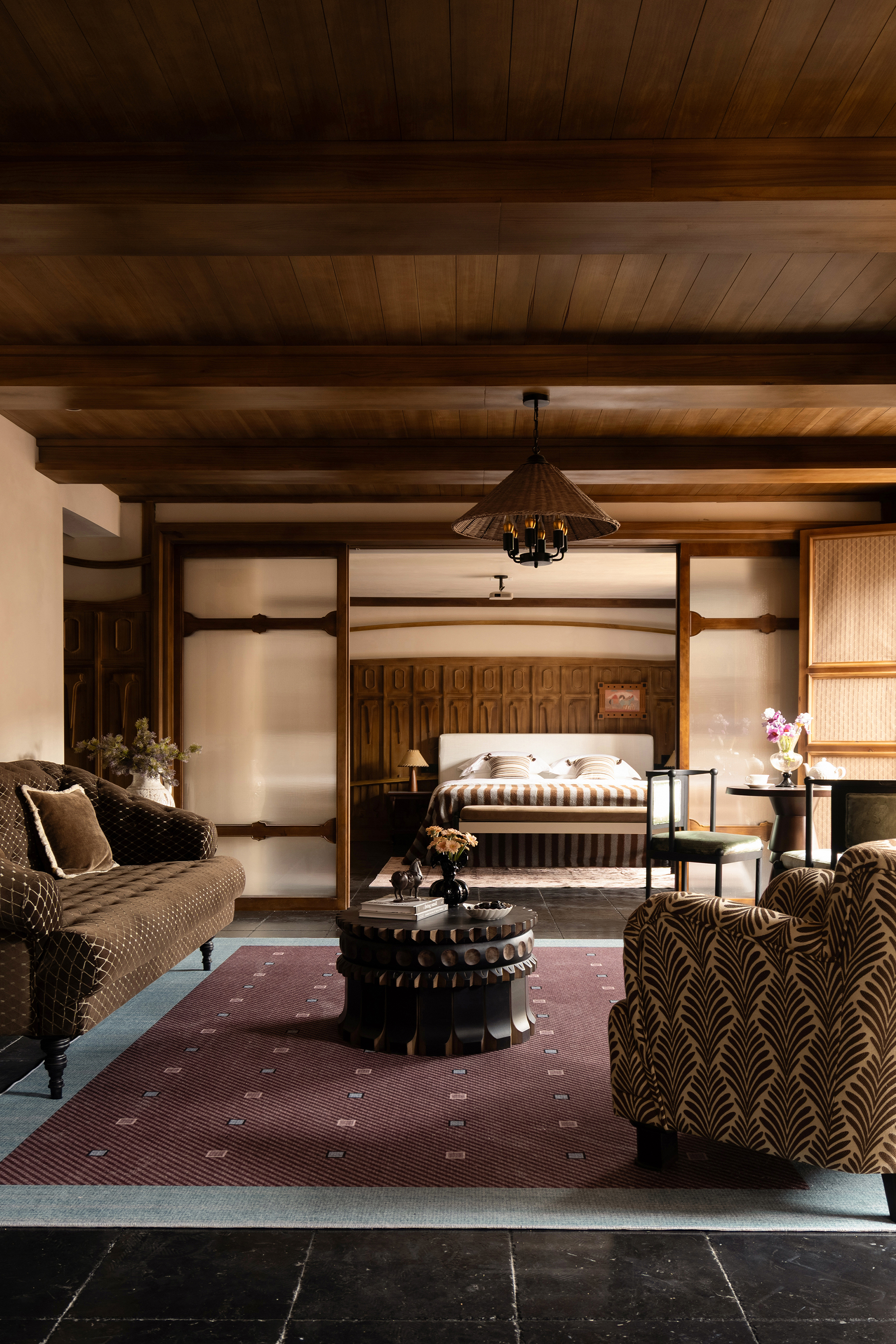 客房设计时护墙则是将雨露以及植物扎根的过程进行了具象化,在很多家具的选型上模糊掉风格的界限,融合了本地木质雕刻的做法,以及在色彩上从藏族传统的色彩中选取颜色,来让沉稳的空间更加的丰富且鲜明。