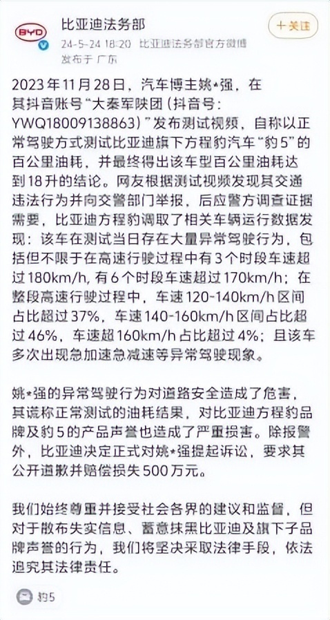 2023 年 12 月,方程豹豹 5 上市之际,姚*强通过抖音账号“大秦军陕团”发布视频,声称以正常驾驶方式测试方程豹旗下车型豹5,得出百公里油耗18升的结论,在网络上引起了大范围的关注及讨论。之后应警方调查取证需要,比亚迪调取数据显示:测试当日车辆存在大量异常驾驶行为,高速行驶过程中有3个时段车速超过180km/h, 有6个时段车速超过170km/h,在整段高速行驶过程中,车速120-140km/h区间占比超过37%,车速140-160km/h区间占比超过46%,车速超160km/h占比超过4%。