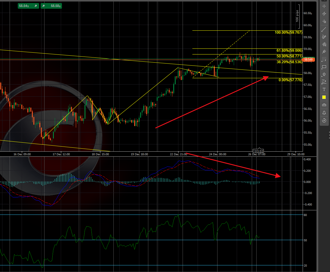 若维持在58.2上方,可看向五浪目标位59附近;