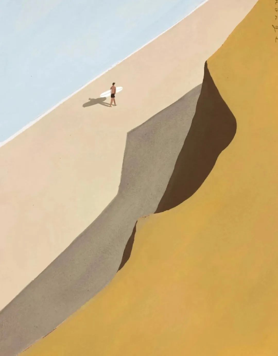 他偷偷向大师“借”灵感:马蒂斯的色块被他改成像素风,毕加索的立体派拆解成扁平设计。比如《夏日冲浪》系列,用几何图形重构了1950年代的复古海报,让年轻人在手机壁纸上感受经典。