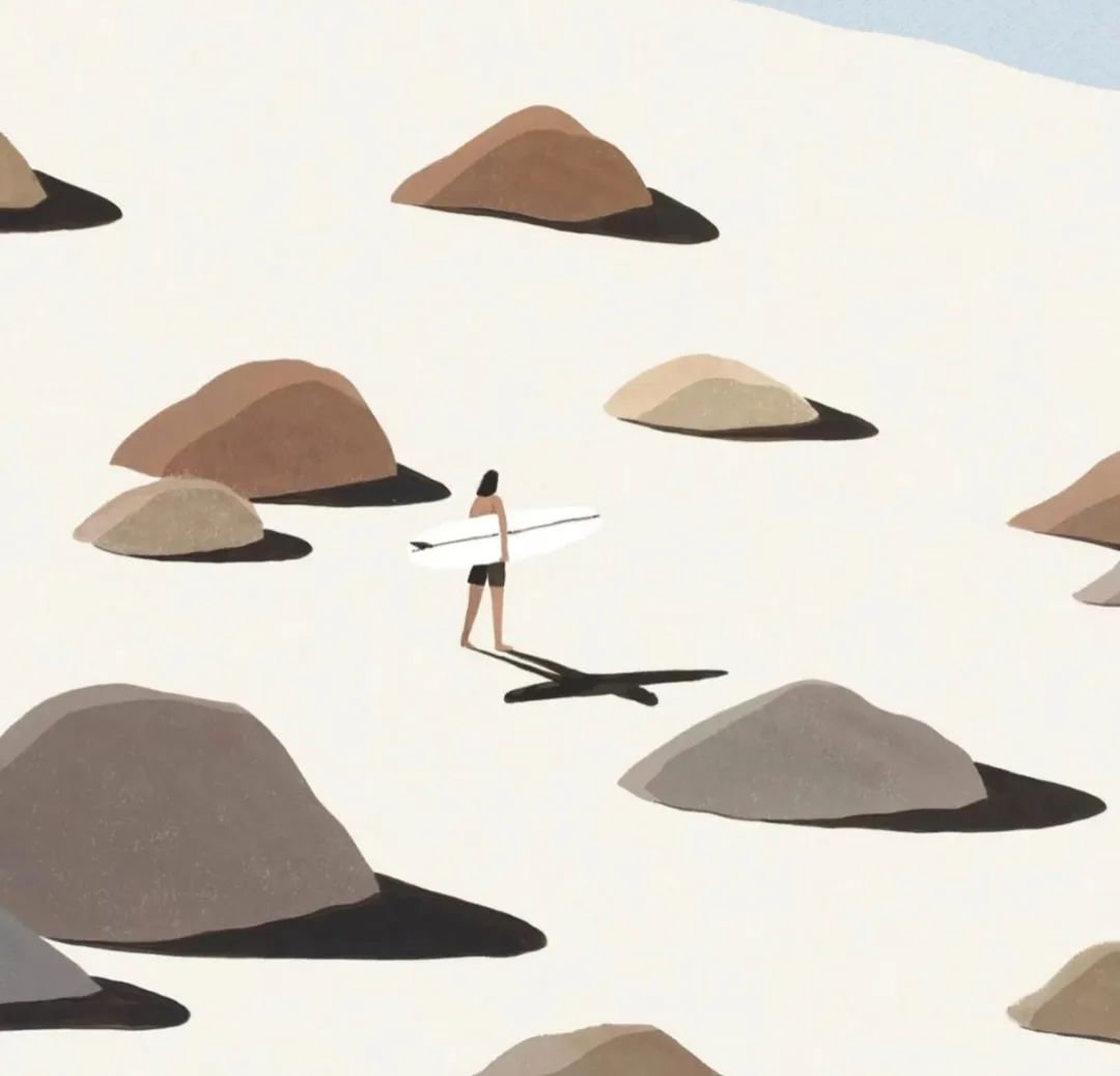 在尼斯的海风中长大,Quentin的童年没有画板,只有木棍与沙滩这对天然搭档。“我总在退潮时抢时间画画,海浪一来,作品就消失了。”这种“瞬逝创作”训练了他对线条的极致提炼:贝壳简化成半圆,渔船只留轮廓,连冲浪者都压缩成色块拼贴。