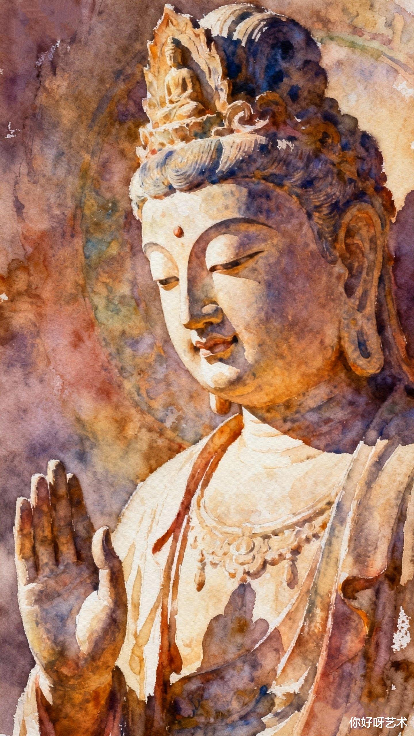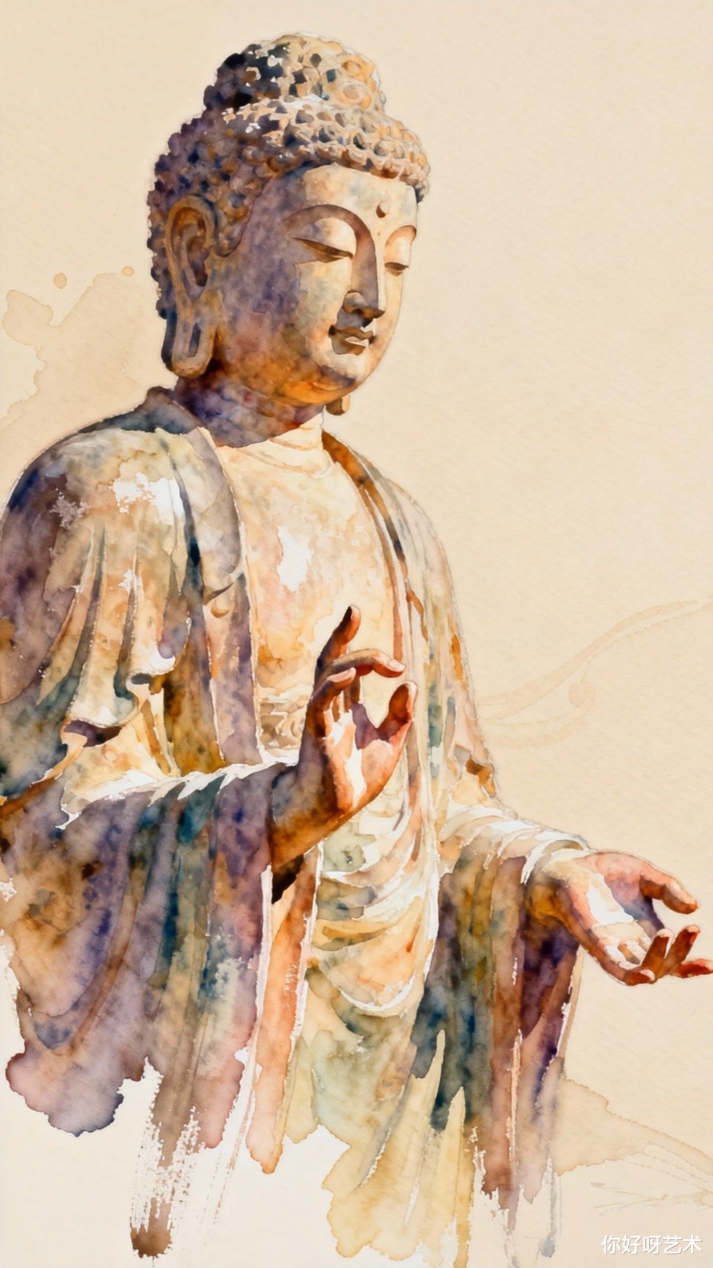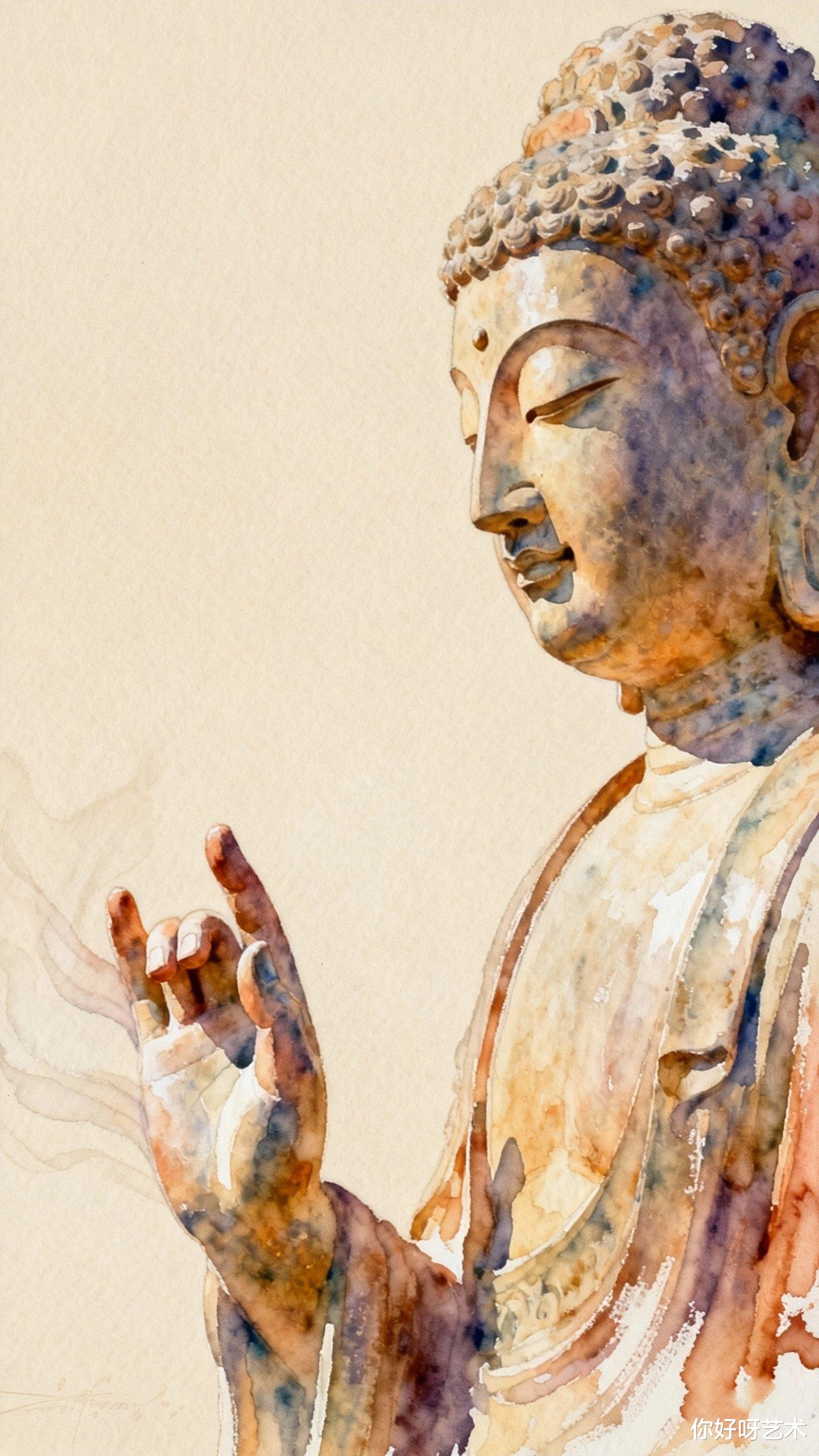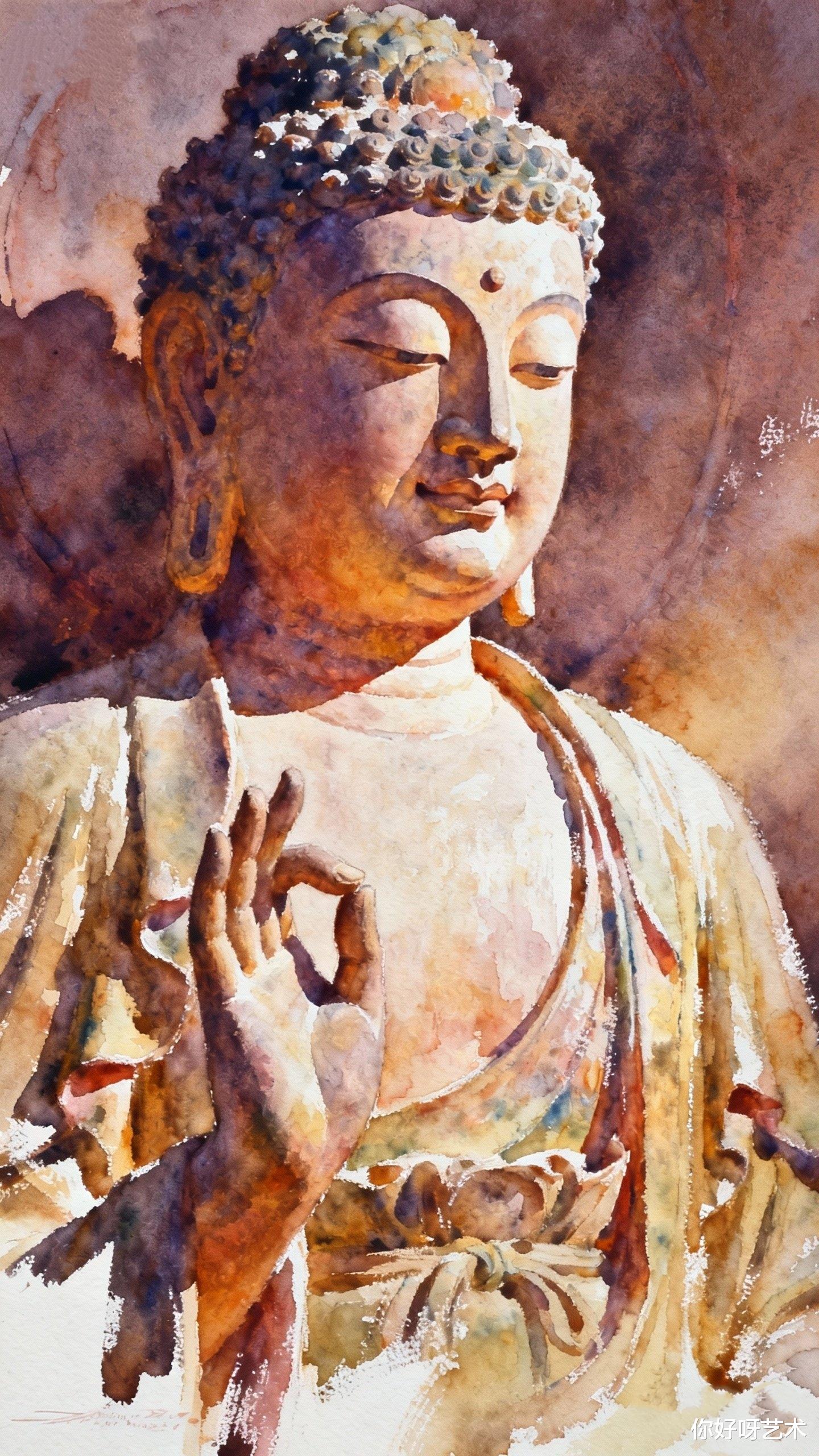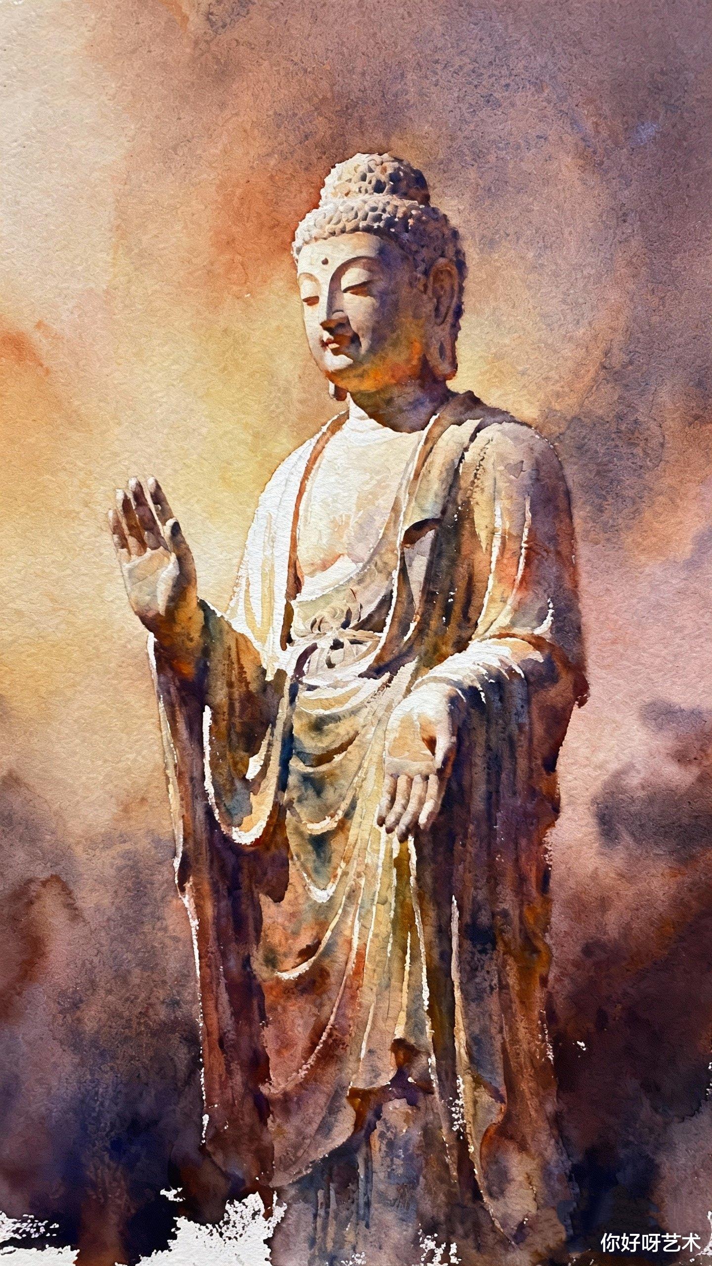 水彩画佛,最难的是“留白”。佛像的庄严,往往不在色彩的浓烈,而在留白的空灵。我常将背景画得极淡,甚至留出大片空白,让佛像在虚无中显形。这空白,像极了人心中的净土——纵使红尘万丈,心亦可如明镜。