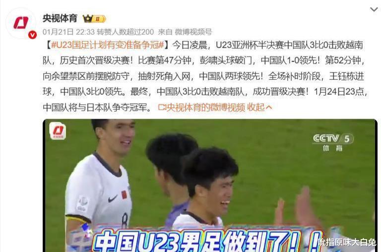 央视体育官宣了U23亚洲杯中日争冠,比赛时间是1月24日23点,并且配上了“计划有变,准备争冠”的词条。确实这届U23国足给我们带来了太多惊喜,从一开始的出线都难到现在闯入决赛,这场比赛值得期待。