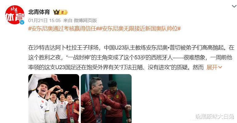安帅有前途,《北青体育》报道,53岁的安东尼奥将担任2005年龄段新一届男足国奥队主教练,冲击2028年洛杉矶奥运会。安东尼奥是一个非常有头脑,有战术的教练,他不呆板一直不变,会根据对手的情况有针对性的佈量战术使用队员。