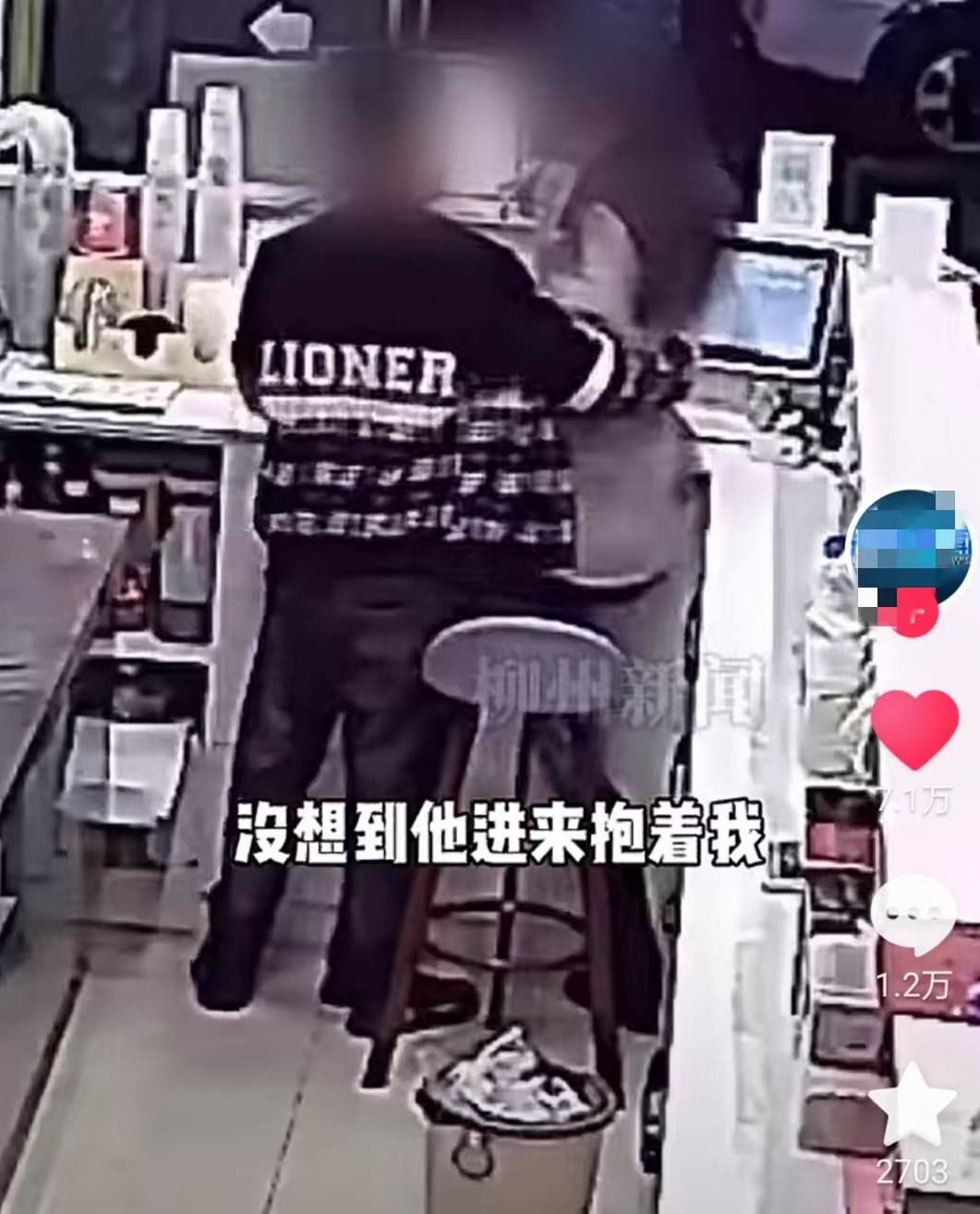 还有,柳州市一家商店里,只有收银员,半夜时分,一名陌生男人进店,一句话不说,直接走进收银台,强行搂抱女店员。