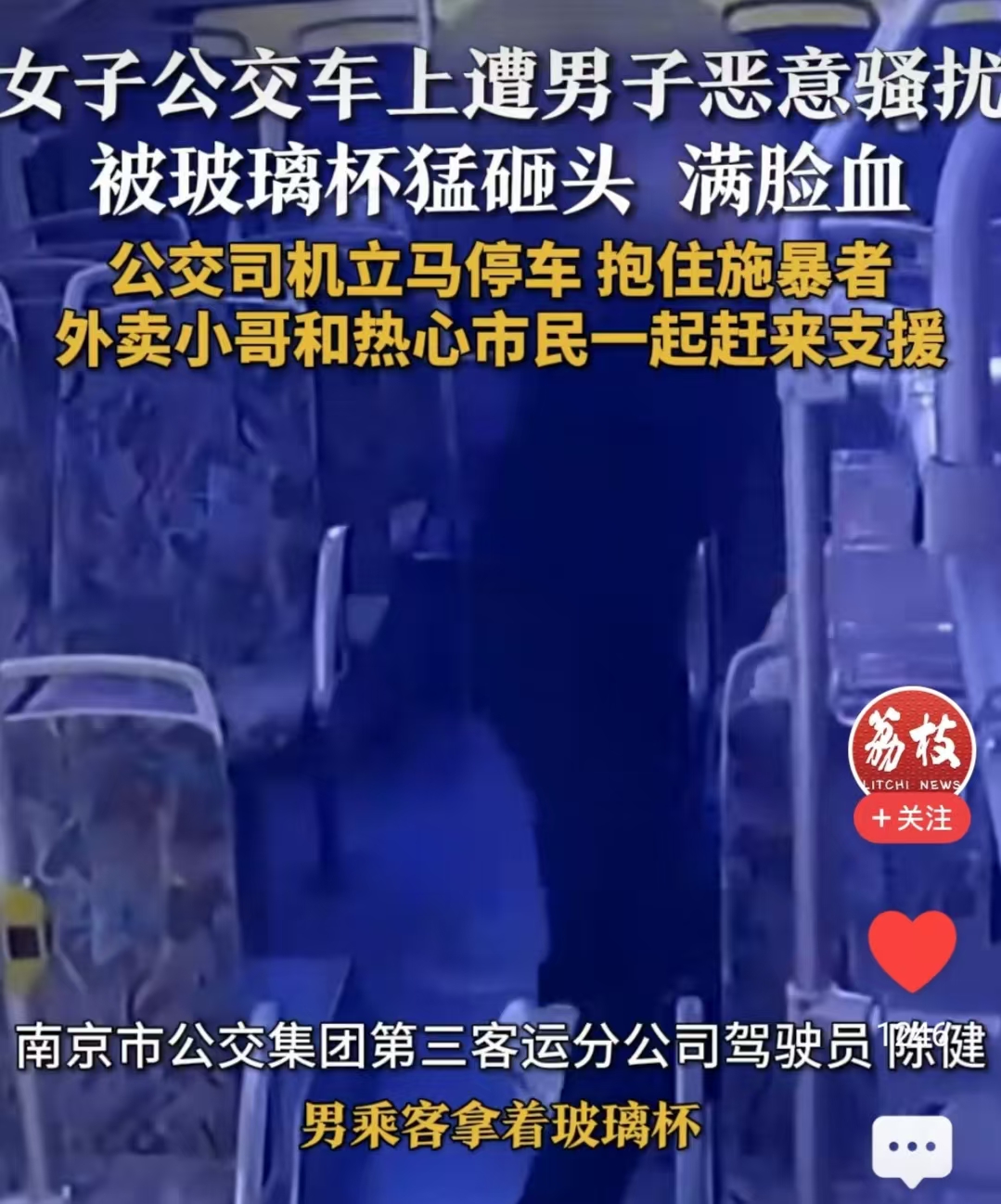 近日,在南京一辆末班公交车上,一名男乘客突然推倒女乘客,拉扯她的衣服,还拿玻璃杯狠狠地砸她,拼命地往后面抱。