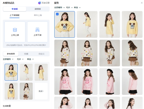 功能目前分为专业版与通用版,两者模特数量与姿势一致,专业版生成质量更高,但点数消耗相对更多,用户可按需求选择。
