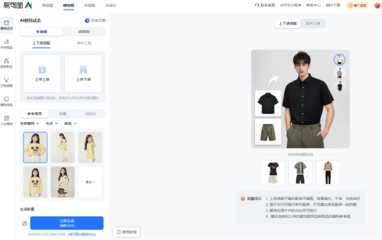 如果是电商卖家或需要制作商品展示图,易可图的AI模特试衣功能更偏向实际商业应用。该功能可将上传的服装图片展示在模特身上,呈现版型、颜色和穿着效果,适用于商品展示图制作。