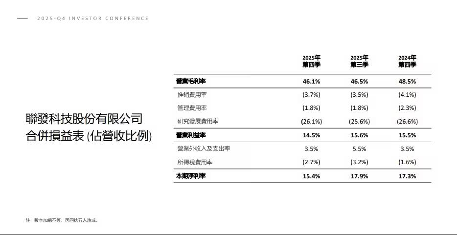 2025 全年,联发科营业收入 5959.66 亿元新台币(现汇率约合 1316.49 亿元人民币),同比增长 12.3%;营业利润 1034.7 亿元新台币(现汇率约合 228.57 亿元人民币)同比增长 1.0%;全年净利润 1061.18 亿元新台币(现汇率约合 234.41 亿元人民币),归母净利润 1053.19 亿元新台币(现汇率约合 232.65 亿元人民币)同比增长 1%;研发费用 1483.06 亿元新台币(现汇率约合 327.61 亿元人民币),同比增长 12.36%;研发占比 24.9% 持平上年。
