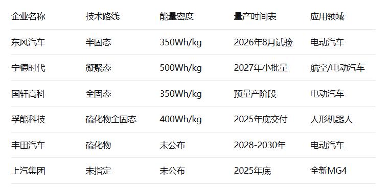 2025-2026年:更多车型试水多家企业计划在这一阶段推出搭载固态电池的车型: