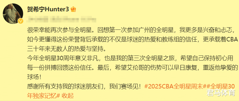 近日,2025CBA全明星赛的球员调整消息引发广泛关注。深圳男篮球员贺希宁在社交媒体发文,表达了对入选全明星的荣幸之情,同时也特别提到了因伤无法参赛的队郭艾伦,言辞恳切地希望他能早日康复,重返心爱的篮球场。