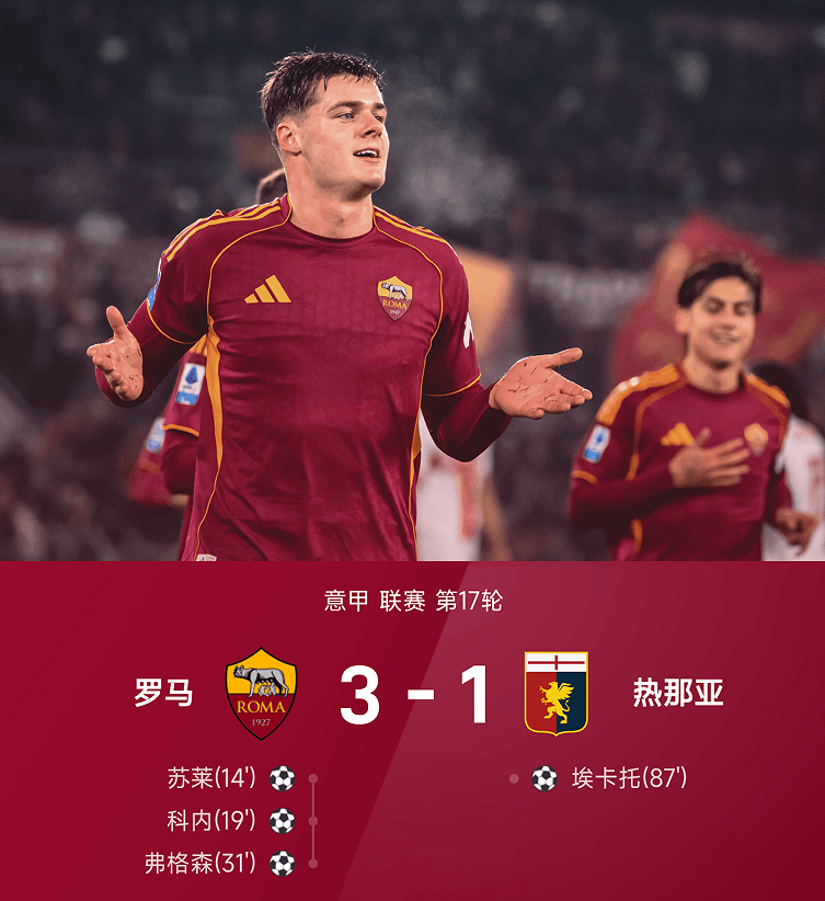 比赛进程完全体现了双方的实力和状态差距,罗马从开场就牢牢掌握了主动权。凭借上半场苏莱、科内和弗格森在17分钟内联手打出的闪电三连击,罗马以3-1轻松取胜。这场胜利不仅让罗马终结了近期联赛的颓势,更让他们的积分达到33分,超越尤文图斯,重新杀回联赛前四的欧冠区域。