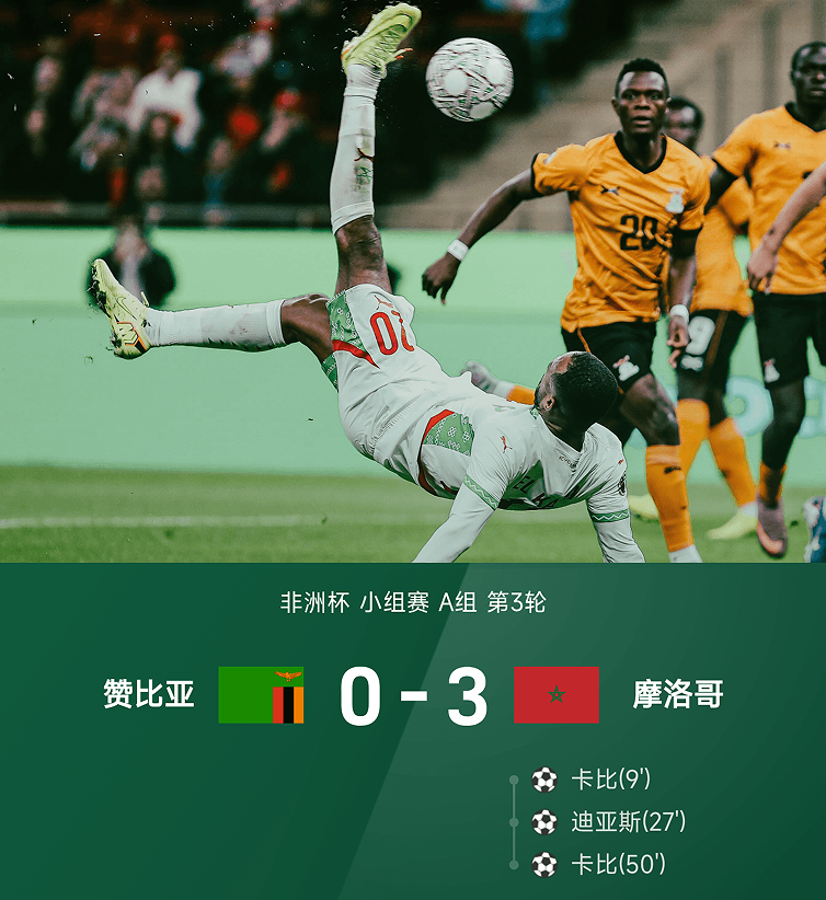 非洲杯战报:卡比双响,迪亚斯建功,摩洛哥3-0赞比亚头名出线