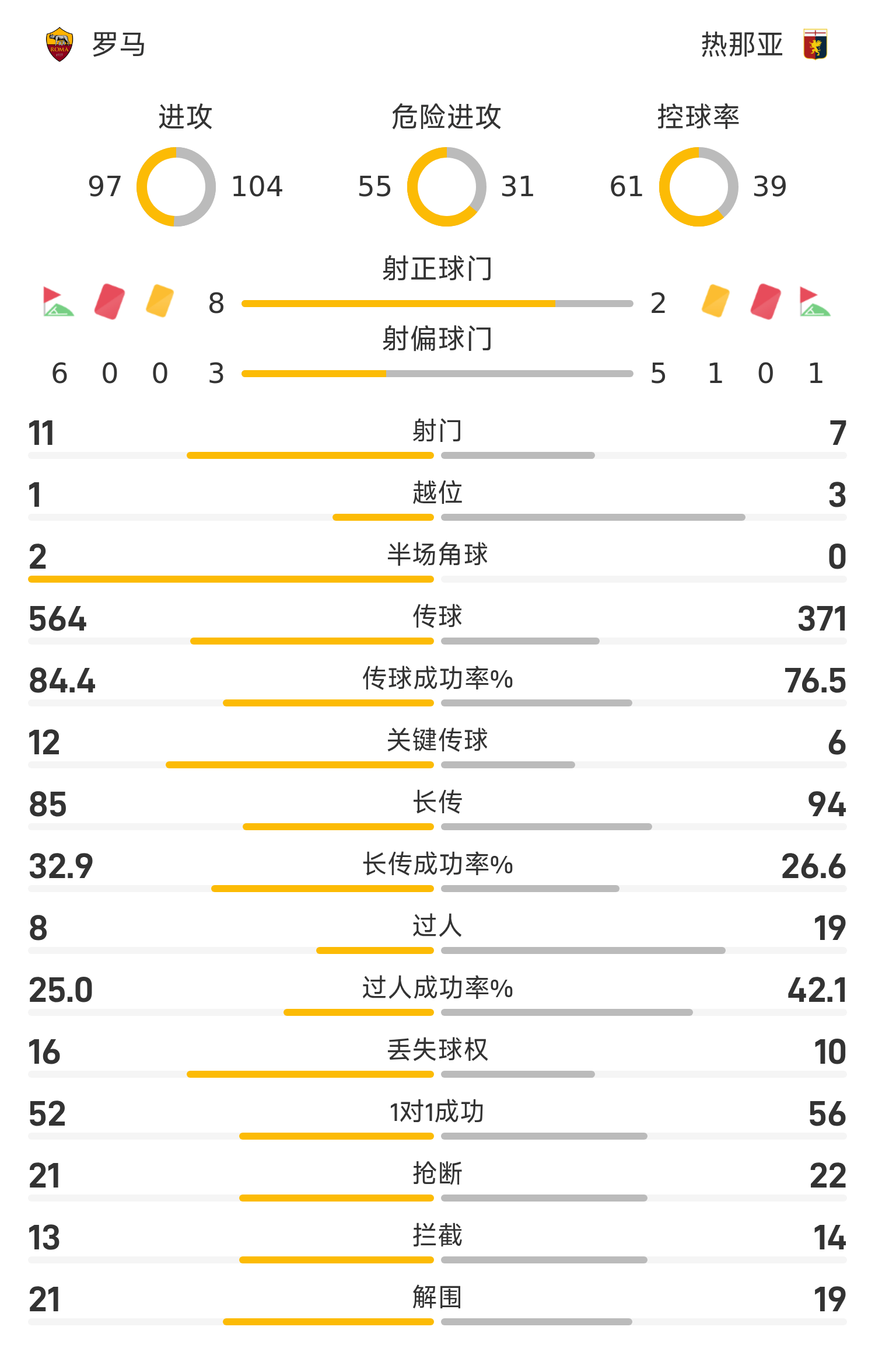 大比分领先后,罗马仍有扩大比分的机会。第39分钟,科内补射破门因冲撞门将在先被判无效。整个上半场,罗马的进攻如水银泻地,而热那亚残缺的防线则显得风雨飘摇。