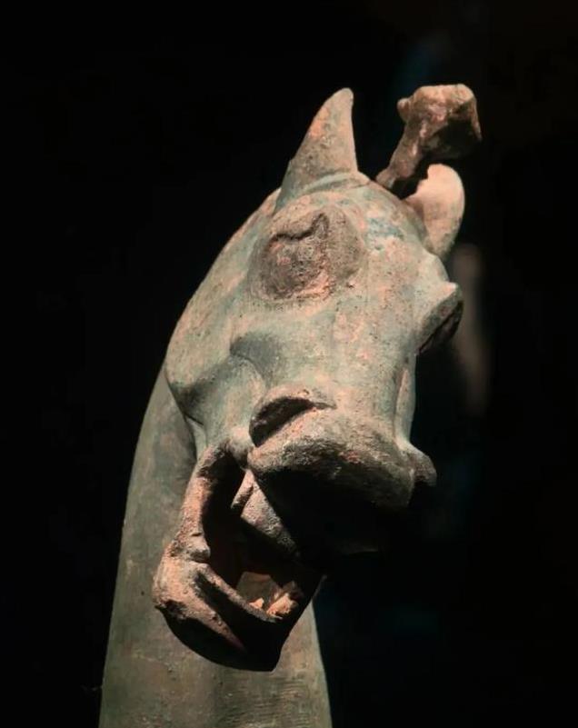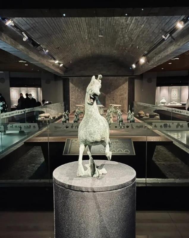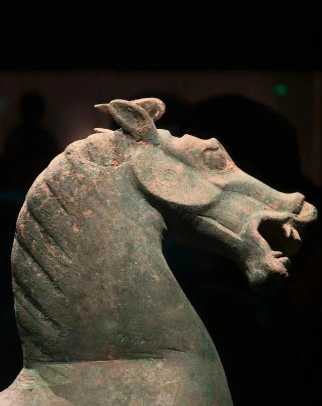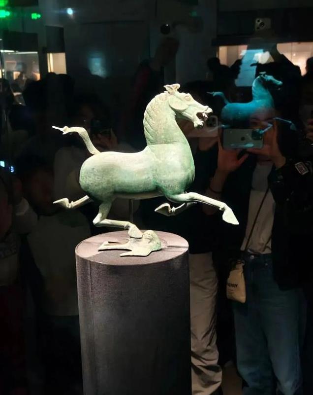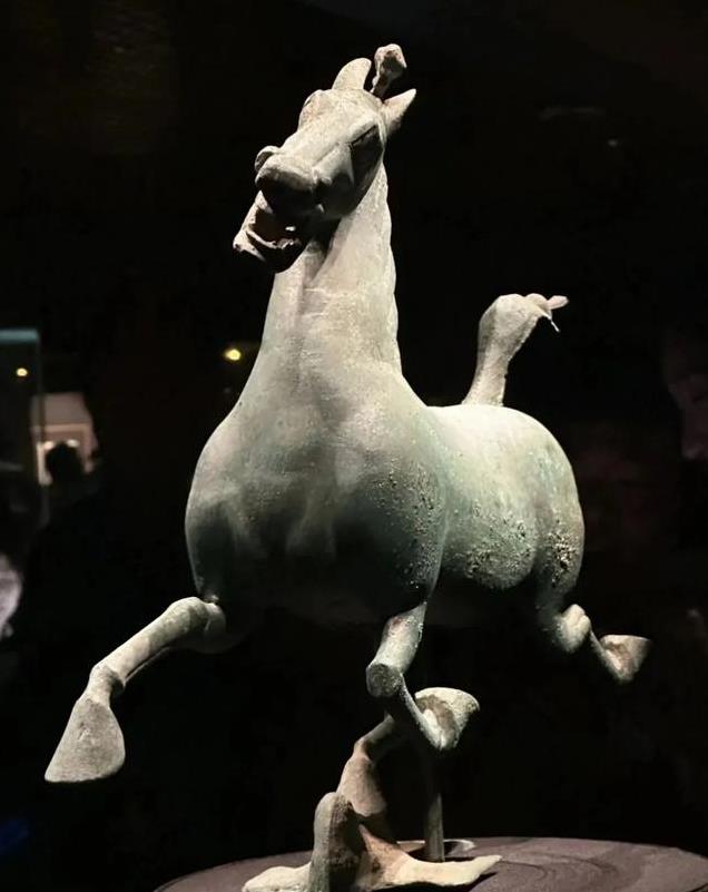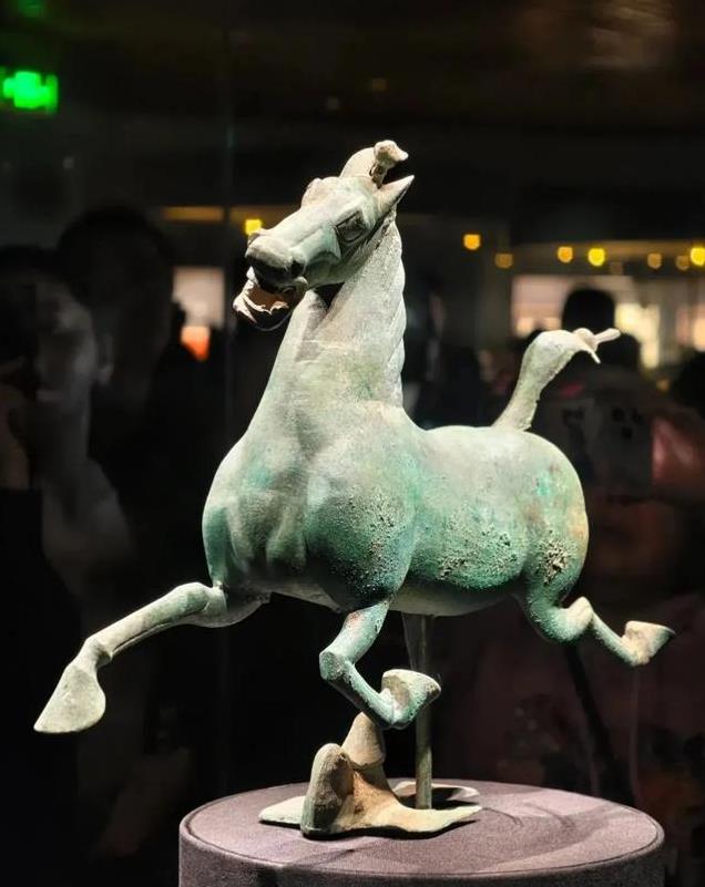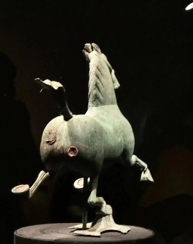 “马踏飞燕”是东汉时期的青铜器,被誉为国宝级文物。马高34.5厘米,长45厘米,宽13.1厘米,重7.3千克。从侧面观赏,马首微微昂起,似乎正在发出嘶鸣,优雅的躯干线条,展示出其健美的肌肉,又显得轻盈灵动,仿佛在极速飞奔,给人带来一种造型优美的观感。如果站在正面看到的却是一个呲牙咧嘴,憨态可掬的形象,让人不禁莞尔,所以一般不拍正面照。