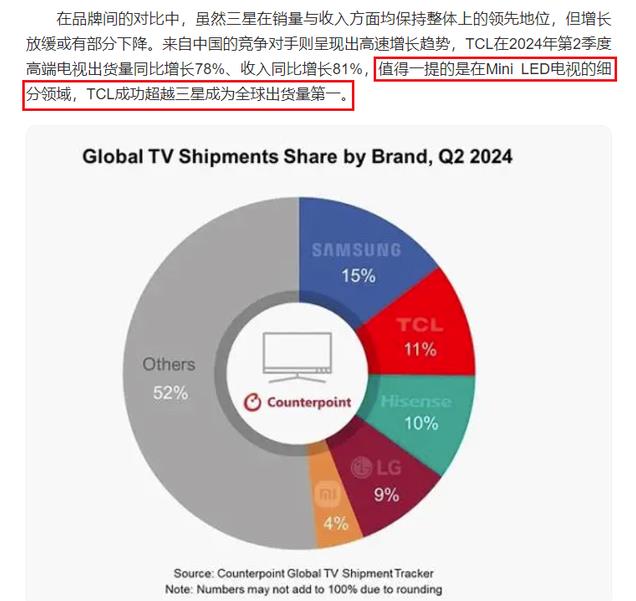 但现在风向变了,Mini LED电视已经凭借着更好的色彩、亮度、对比度和寿命,成为了大屏电视的主流显示技术。并且国产的Mini LED比日韩企业的要好,以国产电视龙头TCL为例,TCL的Mini LED电视,在今年第二季度的出货量已经正式超越了三星,成为了世界第一的Mini LED电视厂商,国产Mini LED电视受到全球消费者的欢迎。
