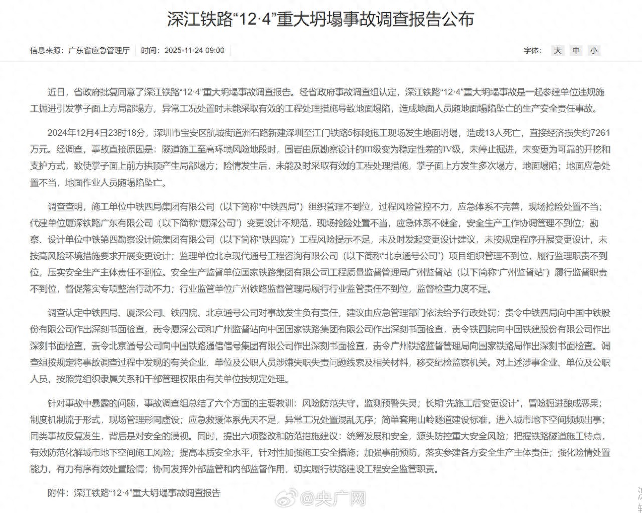24日,广东省应急管理厅发布《深江铁路“12·4”重大坍塌事故调查报告公布》,详情↓