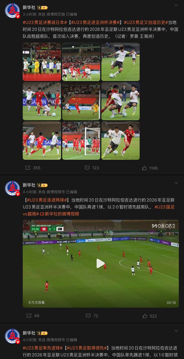 《新华社》则是连发两条进球视频,紧接着又在赛后晒出了中国队的九宫格照片,并配文:“当地时间20日在沙特阿拉伯吉达进行的2026年亚足联U23男足亚洲杯半决赛中,中国队战胜越南队,首次闯入决赛,再度创造历史。”