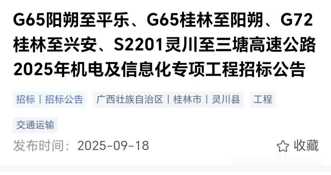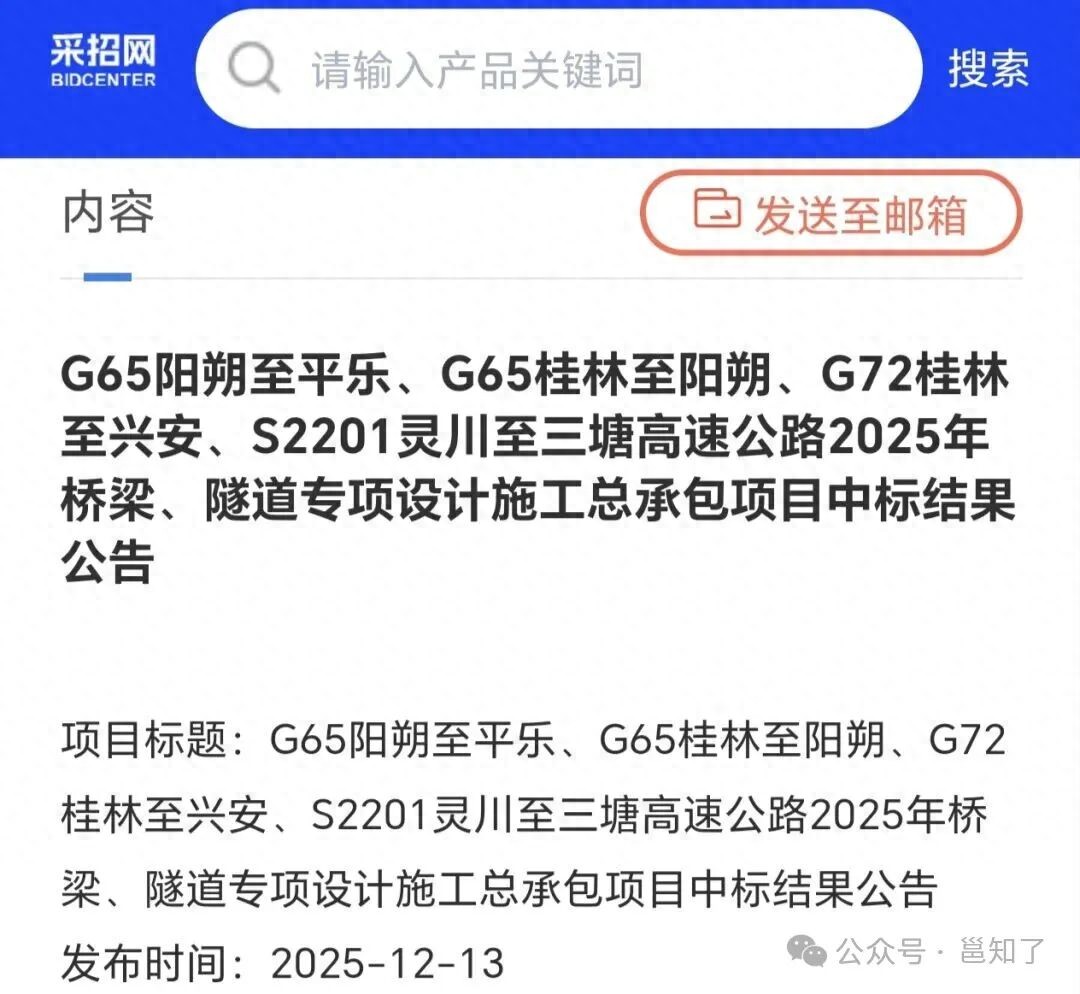 据悉,广西招标网公告,12月13日,G65阳朔至平乐、G65桂林至阳朔、G72桂林至兴安、S2201灵川至三塘高速公路2025年桥梁、隧道专项设计施工总承包项目中标结果公告发布。