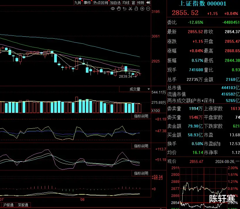 技术上,今日沪指是震荡阳星,本周第一天就开始多空纠结,磨人。今日同比小幅放量。日线kdj指标低位背离构筑中,尚未有效;日线macd指标是多头后的反压未死叉,再度张嘴,这里跟踪多头力度和指标是否能先行。120分钟的kdj指标低位金叉有效多头,macd指标弱空,有低位背离迹象。60、30、15分钟的双指标同步多头。均线看,今日是穿5,差一个点没有上5;boll指标看,三轨道下行,但下行角度很弱。这样看,预计明日沪指会有反弹机会