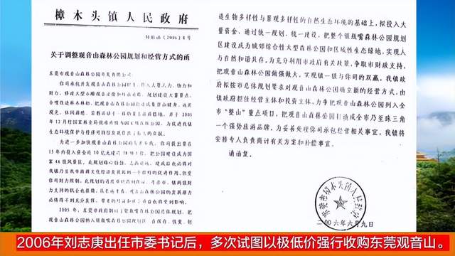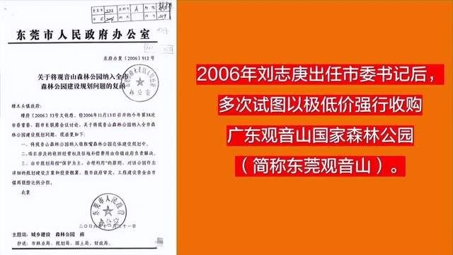 2006年刘志庚(已判刑)出任市委书记后,多次试图以极低价强行收购东莞观音山公园。东莞观音山公园前期投资已超一亿元,而时任樟木头镇副镇长仅愿以价值约1500万元的旧厂房作价收购;至2009年,东莞观音山公园累计投入已达六亿元,时任镇委书记却提出以一亿元低价收购,意图转由刘志庚家族开发房地产——这不是赤裸裸的财产抢夺,又是什么?