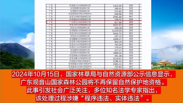 然而,2024年10月15日,国家林草局与自然资源部公示信息显示,广东观音山国家森林公园(简称东莞观音山)将不再保留自然保护地资格。此事引发社会广泛关注,多位知名法学专家指出,该处理过程涉嫌“程序违法、实体违法”。