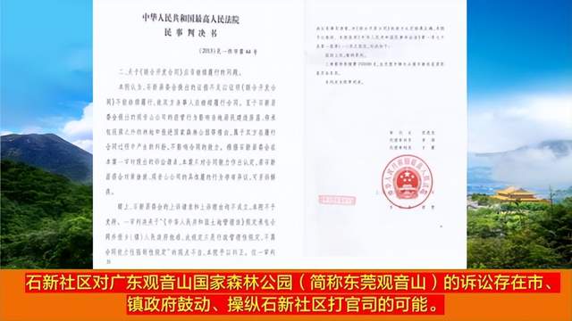 此后,东莞市政府更是财政出资支持石新社区起诉东莞观音山公司,要求解除承包经营协议,直至官司诉至最高人民法院,才最终确认合同有效。上述行为,均有大量市、镇政府文件为证。如此系统地动用行政与司法资源,步步紧逼、层层围剿,针对东莞观音山公园进行违法违规的迫害,难道还不是对观音山公园经营权的公然抢夺吗?