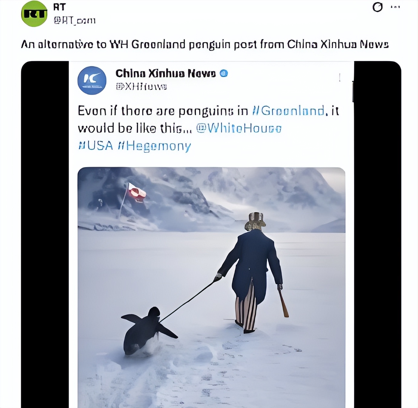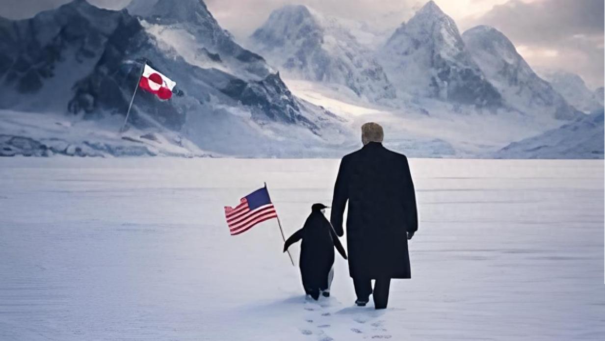日前,白宫在社交平台X上发布了一张AI合成图片:画面中,特朗普身旁站着一只企鹅,企鹅手中高举着美国国旗,二者并肩立于冰天雪地之间,远处还插着格陵兰岛的旗帜。配图文案只有轻飘飘的四个字:“拥抱企鹅”。