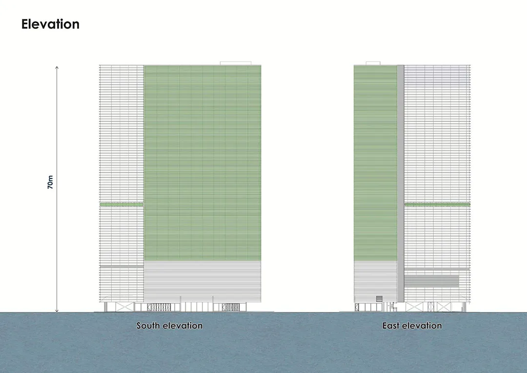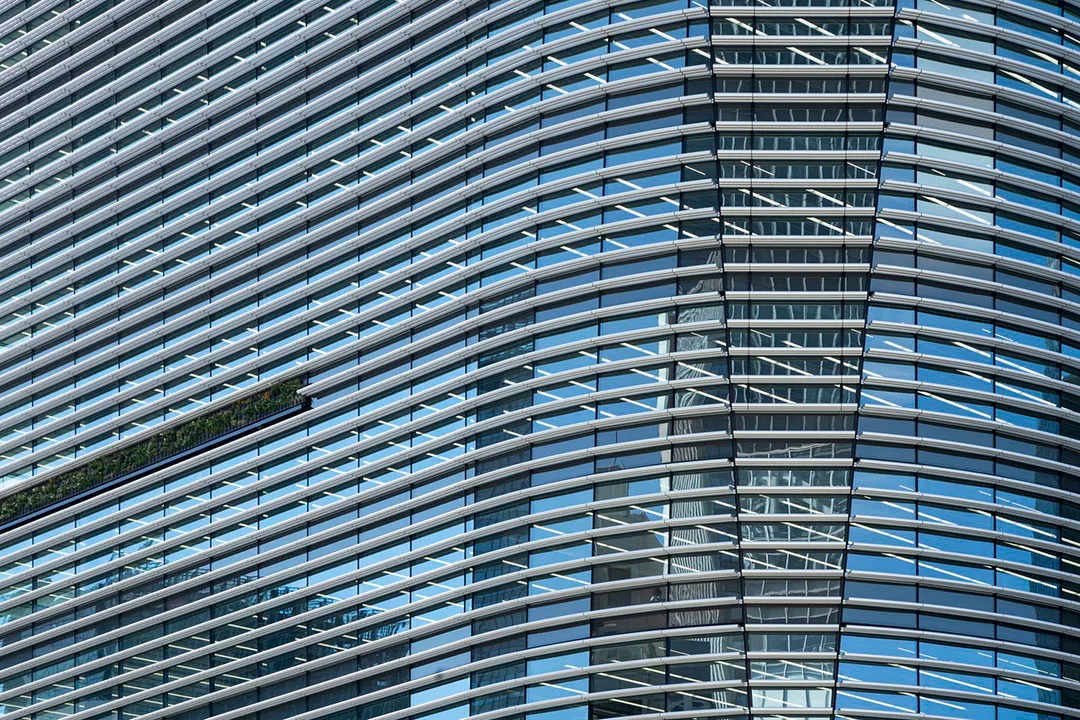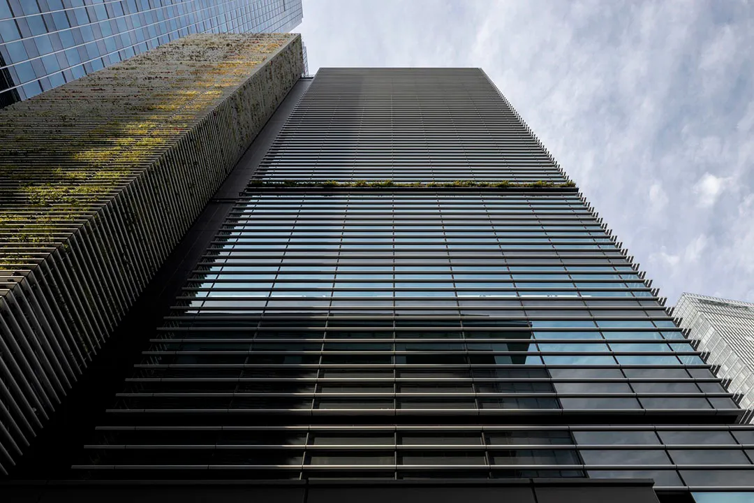 南侧立面是品牌的公共空间,这里有着面积约为800平方米的大型百叶绿化体系,人们在办公区域的任何位置都能够看到绿植系统,来自南侧相邻建筑的目光,也可以直达绿植墙体,这给城市带来了自然的环境体系。
