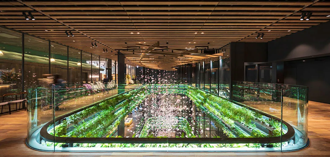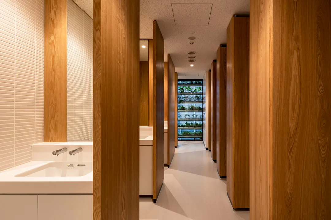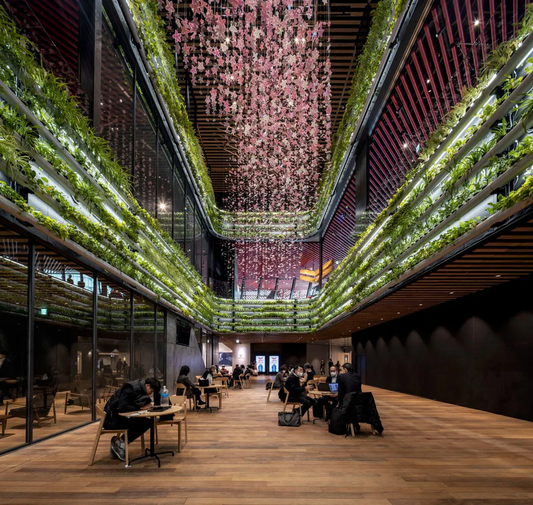 下部楼层的三层中庭绿化,应用了水培技术,LED灯光不仅仅照亮了整个中庭,同时也成为了植物的促生长装备,灯光在一天中可以随时改变色温,这样的亲生物空间在东京站附近很少见到,在这里人们可以自由进出,甚至会有一些差旅人士希望在此度过休闲时光,绿色的中庭院落,结合大规模的绿植立面,这成为了Yanmar品牌与自然互动的特征,空间中的饰面应用了天然材料,诸如木材地板和天花板上的百叶,也代表了自然元素。