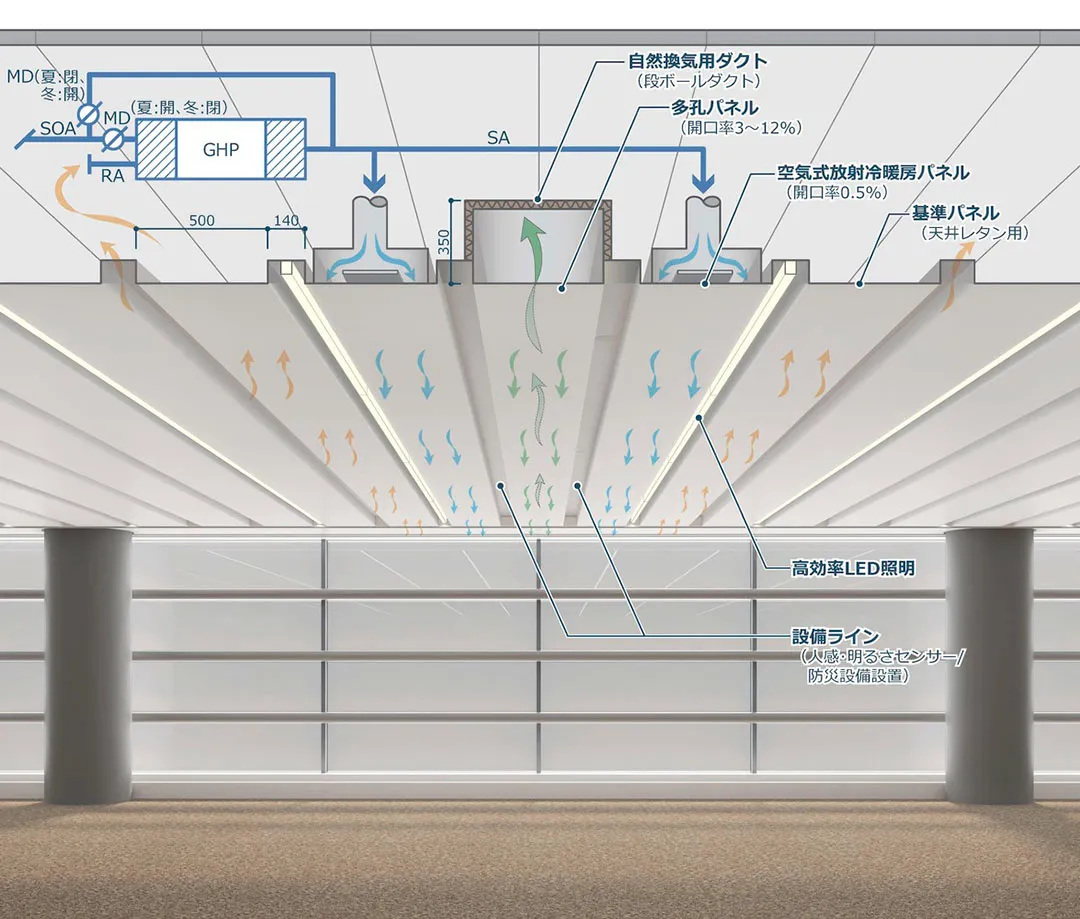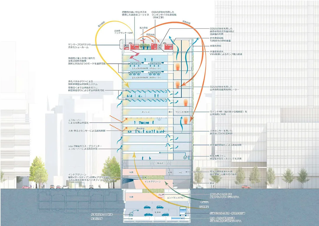生活展厅也同样具有环境意识,建筑使用了节能高效的设备系统,这也是Yanmar公司的产品,比如通过燃气驱动的热电联产系统、应用高效燃气热泵空调的加热冷却系统,目的是满足环保特性,除此之外,这座建筑还融合了防灾、环境,以及生活舒适特征的最新技术,比如楼层之间的抗震结构、地下一层的临时疏散广场、墙体太阳能面板、风能发电,以及应用了辐射和穿孔天花板的自然通风系统。