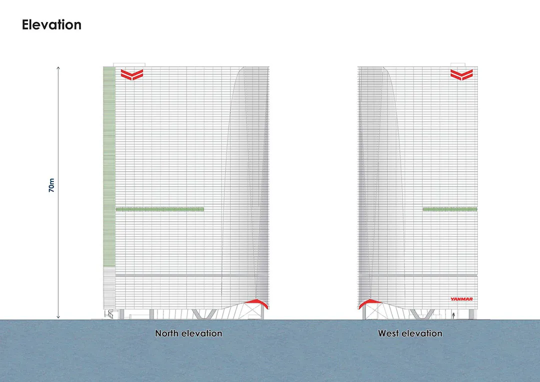 这是一艘如船一般的建筑,似乎正在向着世界扬帆起航,建筑面向东京站一侧覆盖着百叶窗,在地面层和地下层,立面的形态模仿着船头和帆,建筑师的目标是通过强烈的形式感,同时结合纯粹的象征意识,以及场地和道路的关系,场地的夹角形态也促进了建筑的构成,Yaseu是Edo Castle下方曾经的运河区域,同时也是Yanmar的海军领域区域,因此船一般的设计似乎在向世界呐喊。