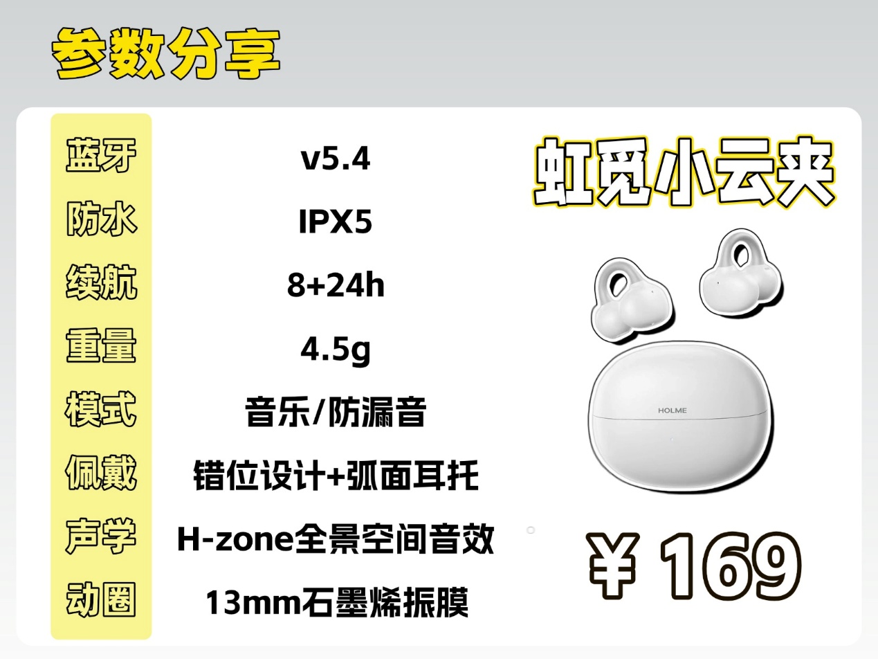 虹觅小云夹:核心配置包括13mm石墨烯振膜、蓝牙5.4、双麦ENC通话降噪,同时支持H-zone全景空间音效和防漏音模式,还有HBC智慧双联功能,可同时连接两台设备。单耳4.5g,IPX5防水级别,单次续航8小时,综合续航24小时,连接稳定、延迟较低,解析力和空间感在同价位中表现出色,日常使用和运动场景都能适配。