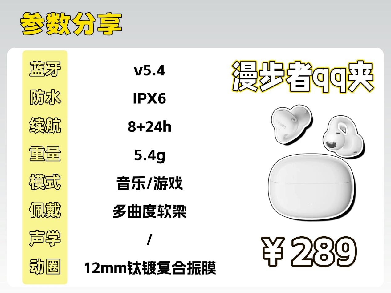 漫步者QQ夹:采用12mm镀钛振膜,搭载蓝牙5.4和双麦ENC降噪,配备DPW定向传音技术减少漏音,支持APP EQ调节和同声传译功能。单耳约5.4g,IPX6防水级别,单次续航7至8小时,综合续航32到35小时,支持快充,连接稳定、人声清晰,防护等级更高,适合长时间通勤和运动使用。
