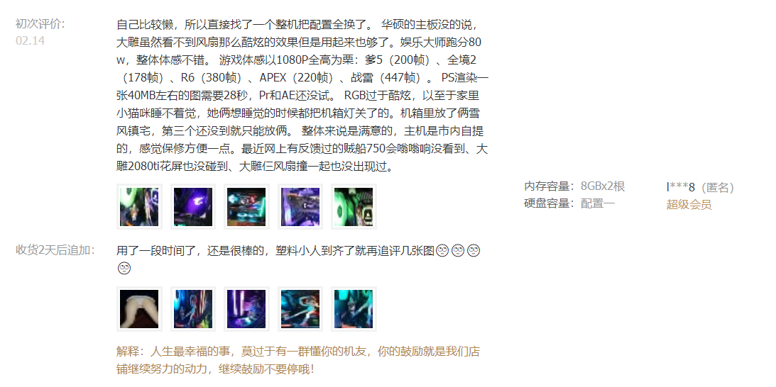 “自己比较懒,所以直接找了一个整机把配置全换了。 华硕的主板没的说,大雕虽然看不到风扇那么酷炫的效果但是用起来也够了。娱乐大师跑分80w,整体体感不错。 游戏体感以1080P全高为栗:爹5(200帧)、全境2(178帧)、R6(380帧)、APEX(220帧)、战雷(447帧)。 PS渲染一张40MB左右的图需要28秒,Pr和AE还没试。 RGB过于酷炫,以至于家里小猫咪睡不着觉,她俩想睡觉的时候都把机箱灯关了的。机箱里放了俩雪风镇宅,第三个还没到就只能放俩。 整体来说是满意的,主机是市内自提的,感觉保修方便一点。最近网上有反馈过的贼船750会嗡嗡响没看到、大雕2080ti花屏也没碰到、大雕仨风扇撞一起也没出现过。”