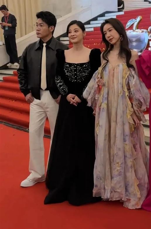 梅婷身着一袭黑色缎面长裙,剪裁简约却暗藏细节——腰部的立体褶皱设计与裙摆的鱼尾廓形,将49岁的她衬托得优雅从容。