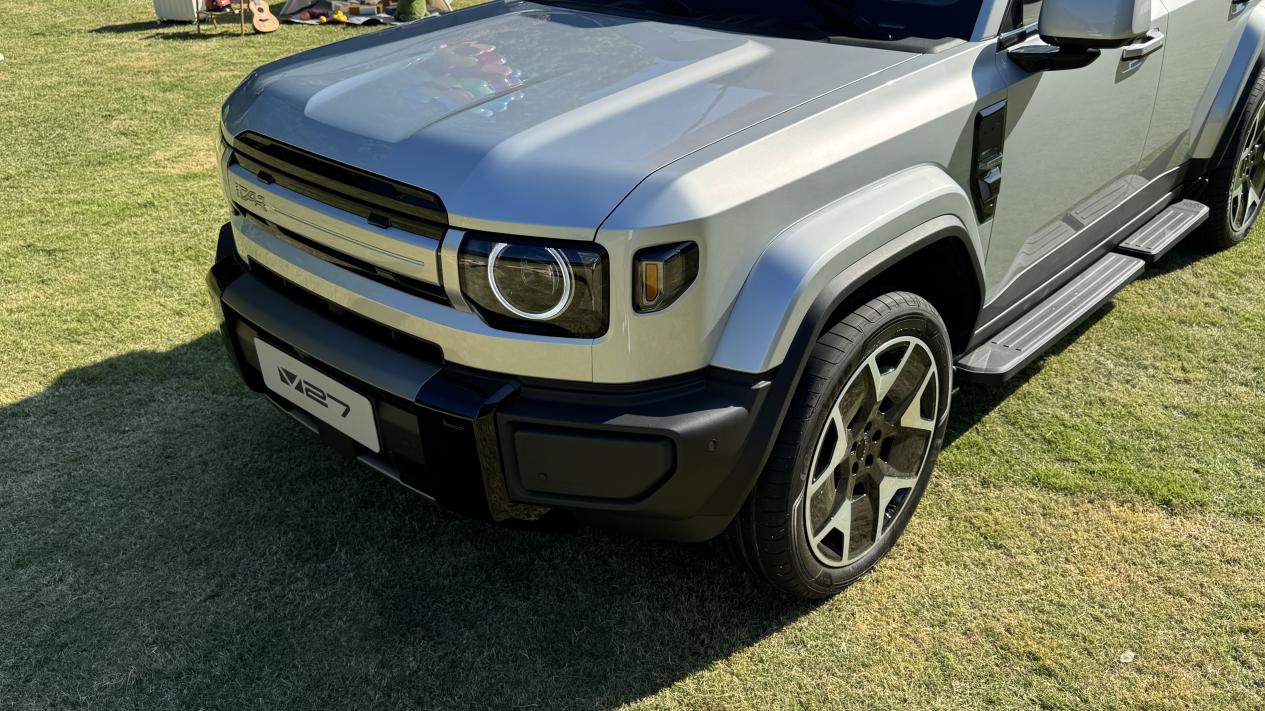承载式车身的iCAR V27,定位家庭新硬派的本质,还是主打家用。作为家用部分的强项,首先就是空间,V27定位中大型SUV,长宽高分别为:4909×1976×1855mm/,轴距2910mm(小书包版),带备胎版的长度则为5055×1976×1894mm,尺寸上会比路虎卫士略小,路虎卫士110为5018×2105×1967mm,轴距3022mm,更接近于方程豹钛7的4999×1995×1865mm,轴距2920mm。