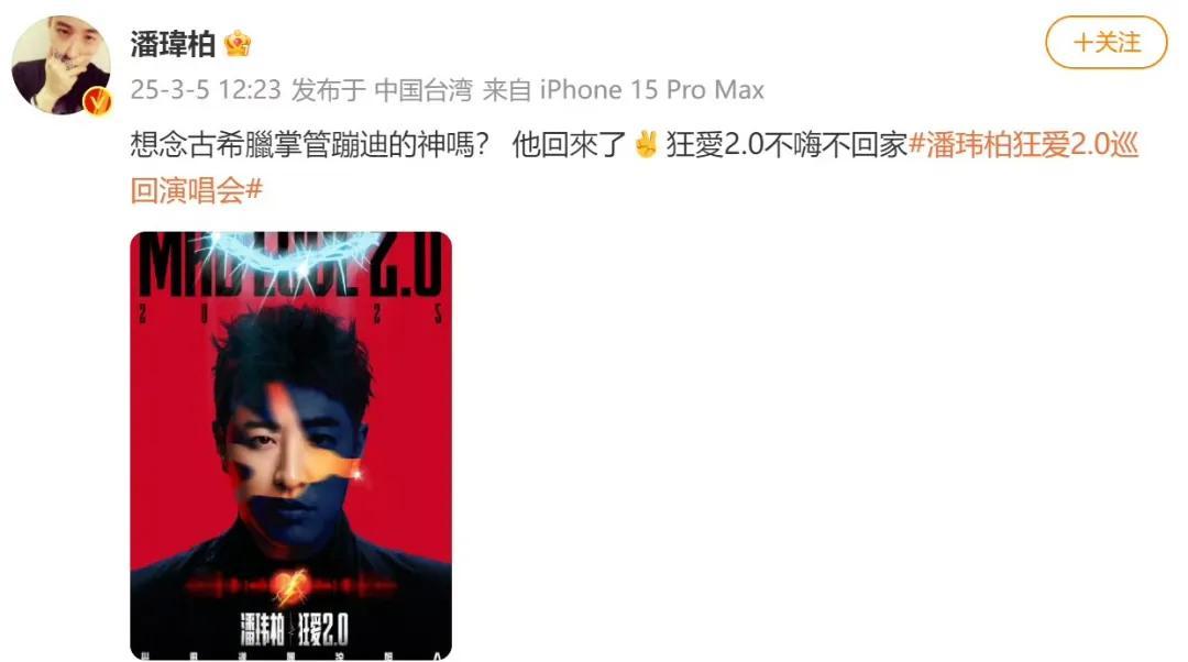 潘玮柏携“狂爱2.0”强势回归,引爆歌迷期待!此次巡演自2025年3月官宣以来,便在社交媒体上掀起一股热潮,也预示着这位华语乐坛的潮流天王将再次用音乐点燃舞台。