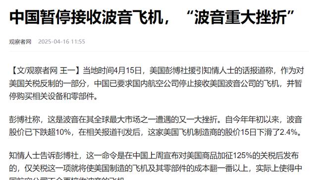 参考来源:观察者网2025.04.16《中国暂停接收波音飞机,“波音重大挫折”》