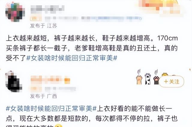 消费者其实早对女装的乱象苦不堪言了,女生的衣服设计越来越极端化,超短的上衣,拖在地上的裤子,低腰的裙子。