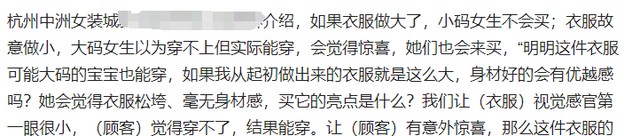 在对一个女装店主的采访中,她说到衣服做小,大码的女生以为穿不上,实际试穿以后发现可以穿,会有惊喜感,那么她们也会来买。
