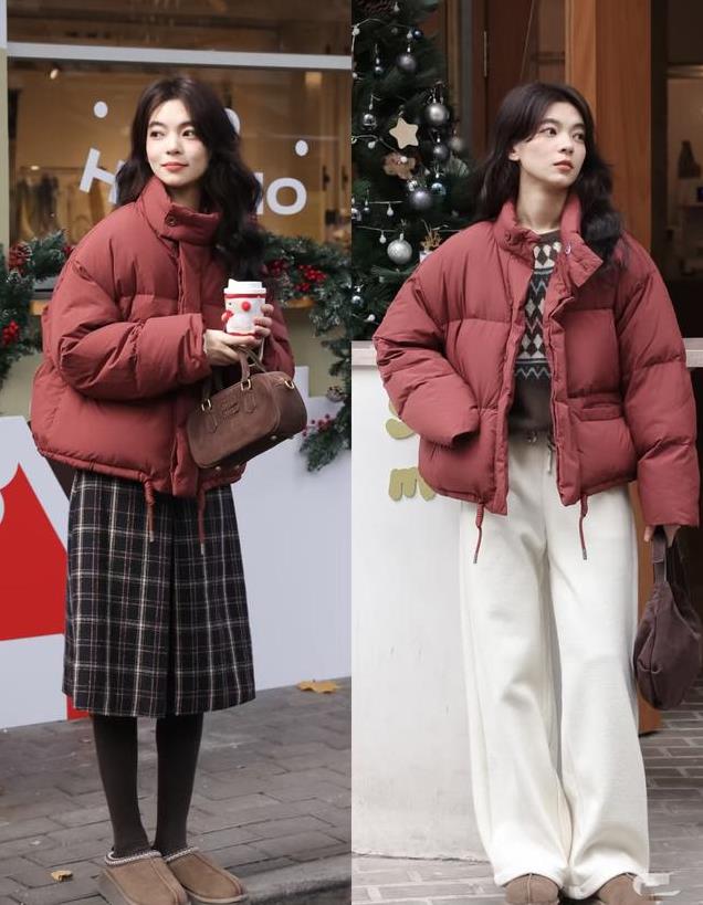 如果天气稍微冷一点的时候,我们还可以搭配红色系的羽绒服来穿,新年氛围感就更浓郁了,这样的搭配好讨喜。