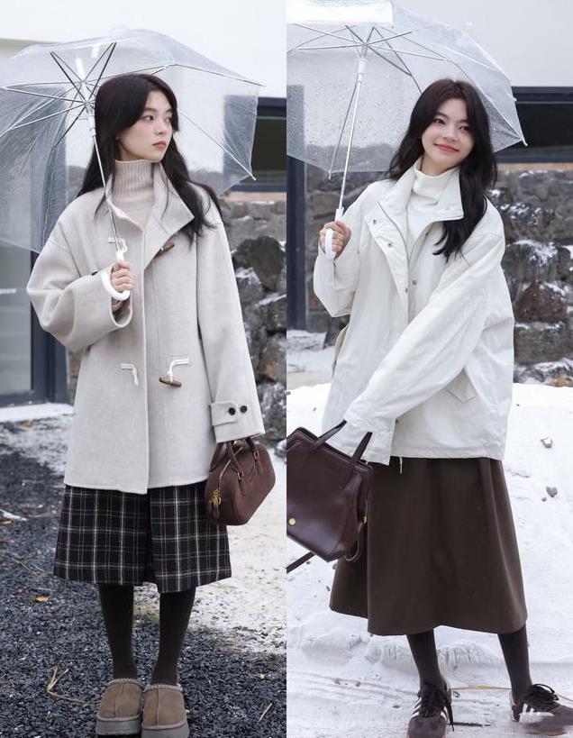 喜欢减龄一点的穿搭,可以尝试搭配学院风的毛呢半身裙。比如棕色的伞裙、或者棕色的格子半身裙。