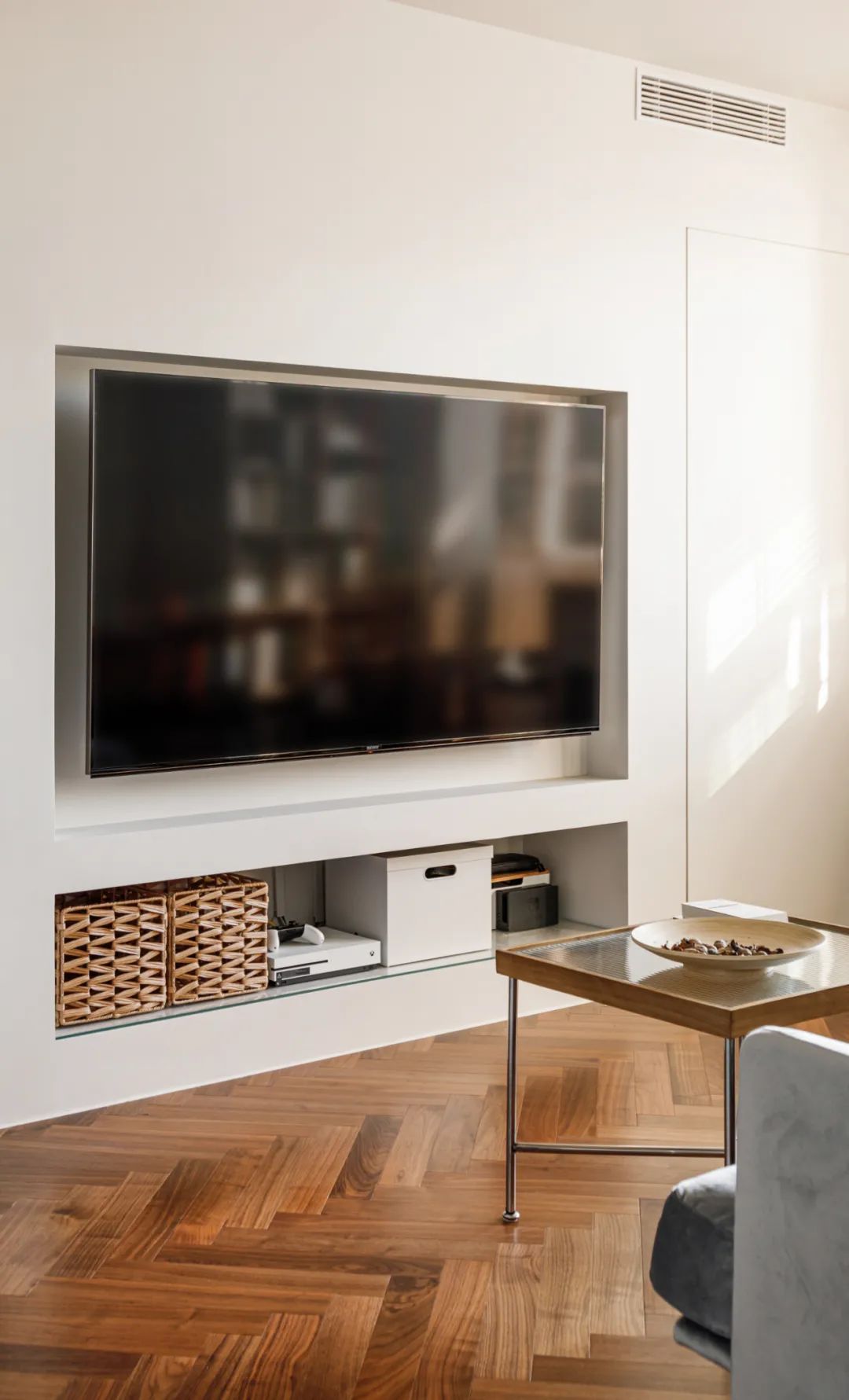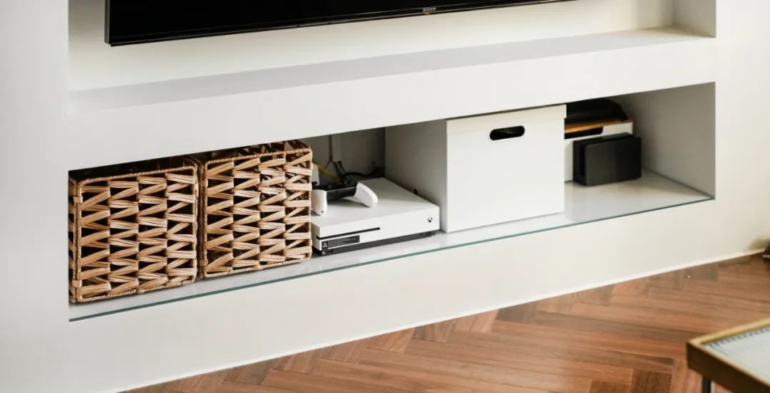 电视部分向墙内嵌入15cm,下方的置物格嵌入45cm作为电视柜功能来使用,可以用来放置市面上大部分的相关设备。