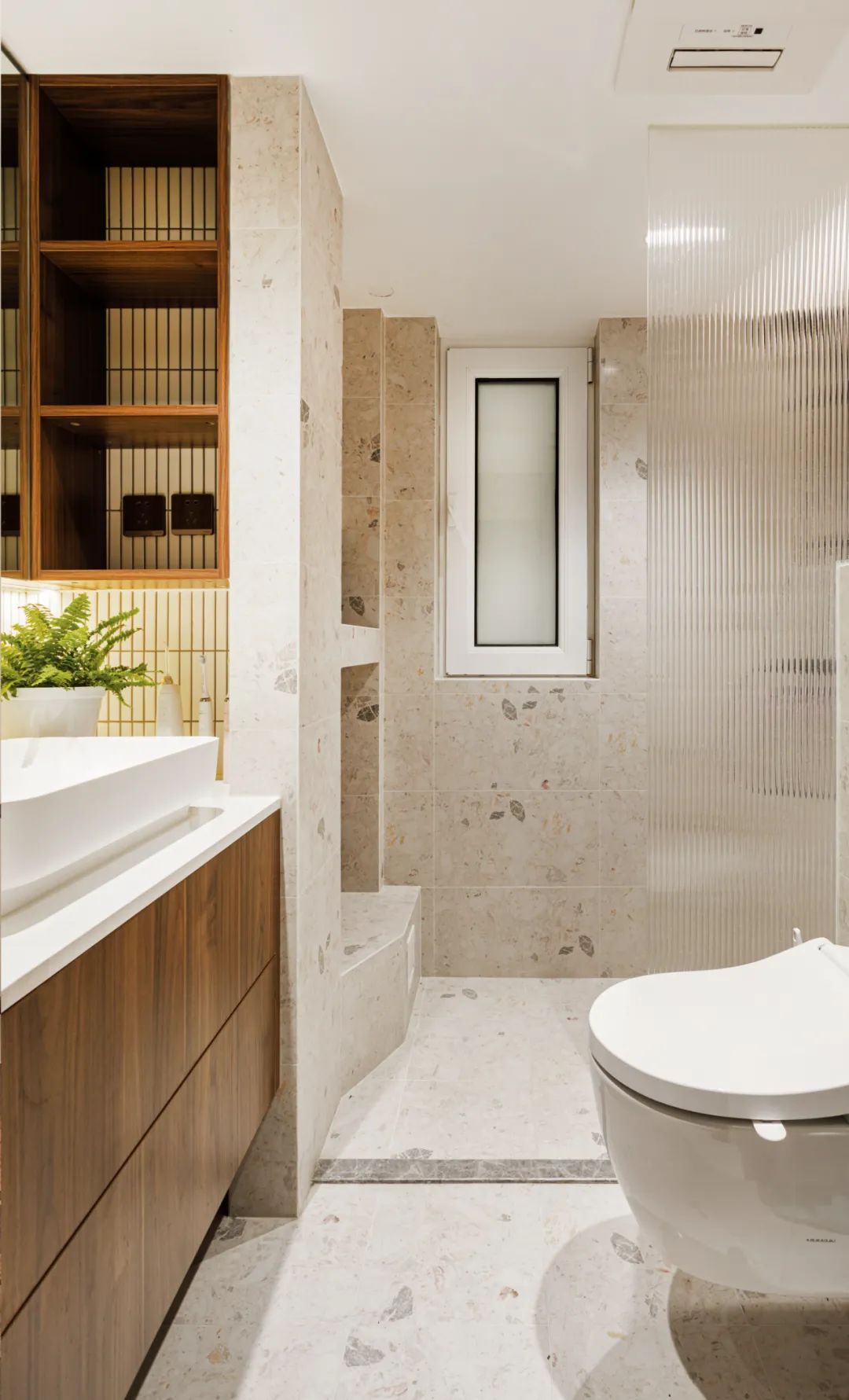 同时有了足够大的淋浴间,使用起来更舒适,淋浴间也同时设置了较大的壁龛用来置物。